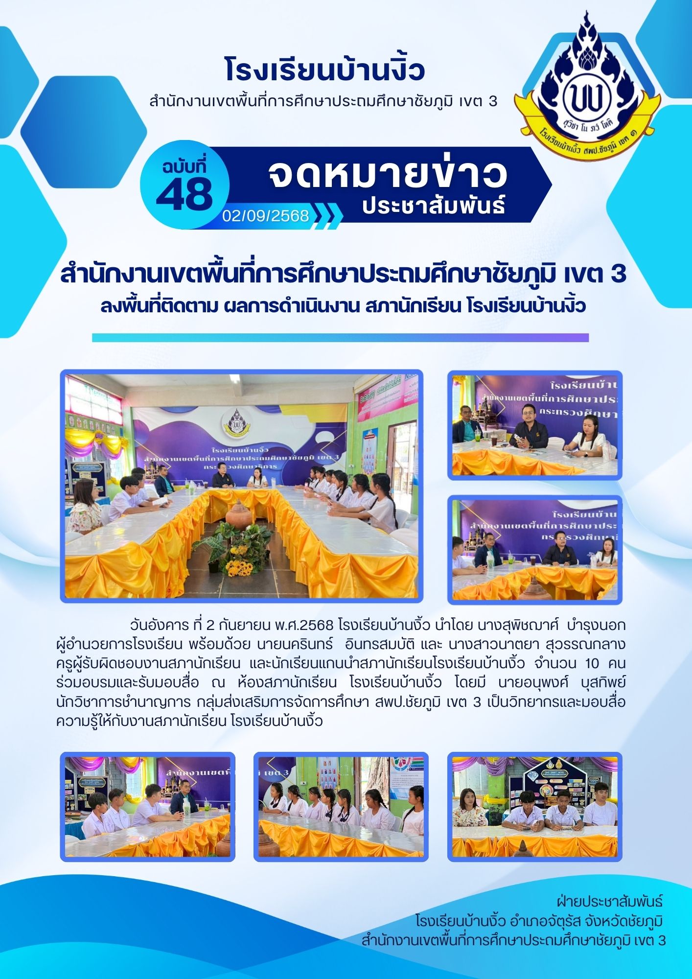 1 | วันอังคาร ที่ 2 กันยายน พ.ศ.2568 โรงเรียนบ้านงิ้ว นำโดย นางสุพิชฌาศ์ บำรุงนอก ผู้อำนวยการโรงเรียน พร้อมด้วย นายนครินทร์ อินทรสมบัติ และ นางสาวนาตยา สุวรรณกลาง ครูผู้รับผิดชอบงานสภานักเรียน และนักเรียนแกนนำสภานักเรียนโรงเรียนบ้านงิ้ว จำนวน 15 คน ร่วมอบรมและรับมอบสื่อ เกี่ยวกับ ความเท่าเทียมทางเพศ ณ ห้องสภานักเรียน โรงเรียนบ้านงิ้ว โดยมี นายอนุพงศ์ บุสทิพย์ นักวิชาการชำนาญการ กลุ่มส่งเสริมการจัดการศึกษา สพป.ชัยภูมิ เขต 3 เป็นวิทยากรและมอบสื่อความรู้ให้กับงานสภานักเรียน โรงเรียนบ้านงิ้ว