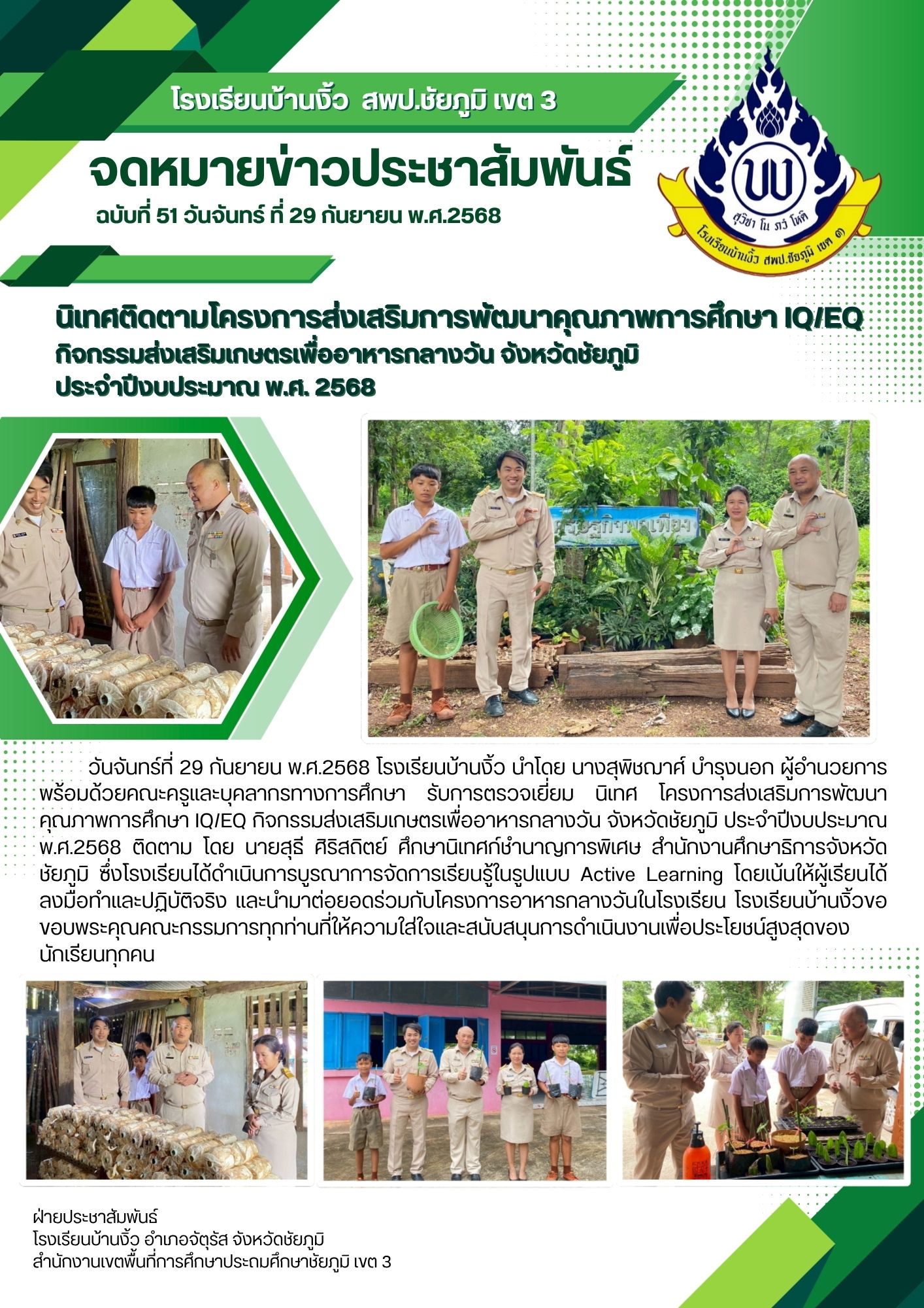 3 | วันจันทร์ที่ 29 กันยายน พ.ศ.2568 โรงเรียนบ้านงิ้ว นำโดย นางสุพิชฌาศ์ บำรุงนอก ผู้อำนวยการ พร้อมด้วยคณะครูและบุคลากรทางการศึกษา รับการตรวจเยี่ยม นิเทศ โครงการส่งเสริมการพัฒนาคุณภาพการศึกษา IQ/EQ กิจกรรมส่งเสริมเกษตรเพื่ออาหารกลางวัน จังหวัดชัยภูมิ ประจำปีงบประมาณ พ.ศ.2568 ติดตาม โดย นายสุธี ศิริสถิตย์ ศึกษานิเทศก์ชำนาญการพิเศษ สำนักงานศึกษาธิการจังหวัดชัยภูมิ ซึ่งโรงเรียนได้ดำเนินการบูรณาการจัดการเรียนรู้ในรูปแบบ Active Learning โดยเน้นให้ผู้เรียนได้ลงมือทำและปฏิบัติจริง และนำมาต่อยอดร่วมกับโครงการอาหารกลางวันในโรงเรียน โรงเรียนบ้านงิ้วขอขอบพระคุณคณะกรรมการทุกท่านที่ให้ความใส่ใจและสนับสนุนการดำเนินงานเพื่อประโยชน์สูงสุดของนักเรียนทุกคน
