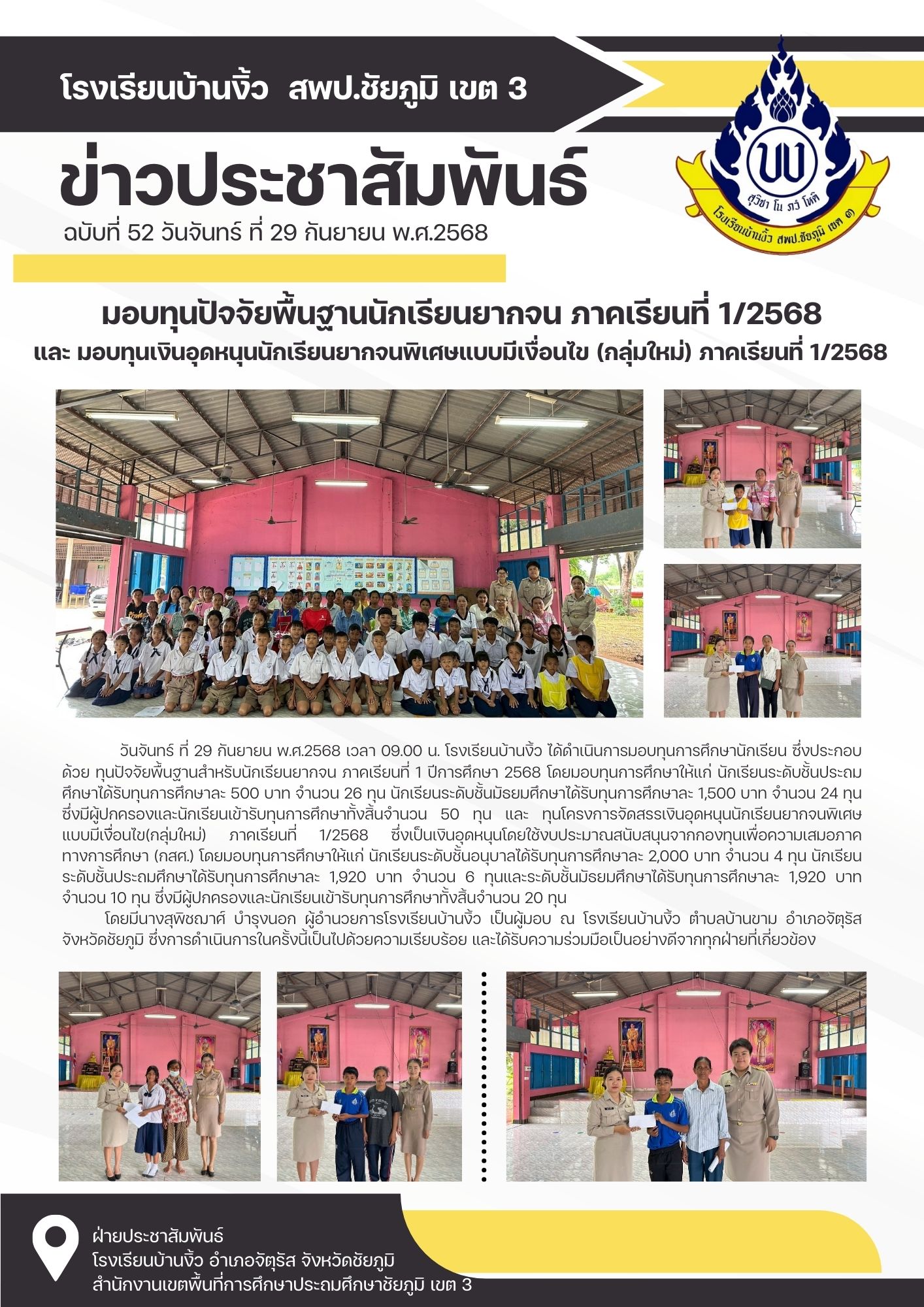 4 | วันจันทร์ ที่ 29 กันยายน พ.ศ.2568 เวลา 09.00 น. โรงเรียนบ้านงิ้ว ได้ดำเนินการมอบทุนการศึกษานักเรียน ซึ่งประกอบด้วย แโดยมอบทุนการศึกษาให้แก่ นักเรียนระดับชั้นประถมศึกษาได้รับทุนการศึกษาละ 500 บาท จำนวน 26 ทุน นักเรียนระดับชั้นมัธยมศึกษาได้รับทุนการศึกษาละ 1,500 บาท จำนวน 24 ทุนซึ่งมีผู้ปกครองและนักเรียนเข้ารับทุนการศึกษาทั้งสิ้นจำนวน 50 ทุน และ ทุนโครงการจัดสรรเงินอุดหนุนนักเรียนยากจนพิเศษ แบบมีเงื่ิอนไข(กลุ่มใหม่) ภาคเรียนที่ 1/2568 ซึ่งเป็นเงินอุดหนุนโดยใช้งบประมาณสนับสนุนจากกองทุนเพื่อความเสมอภาค ทางการศึกษา (กสศ.) โดยมอบทุนการศึกษาให้แก่ นักเรียนระดับชั้นอนุบาลได้รับทุนการศึกษาละ 2,000 บาท จำนวน 4 ทุน นักเรียนระดับชั้นประถมศึกษาได้รับทุนการศึกษาละ 1,920 บาท จำนวน 6 ทุนและระดับชั้นมัธยมศึกษาได้รับทุนการศึกษาละ 1,920 บาท จำนวน 10 ทุน ซึ่งมีผู้ปกครองและนักเรียนเข้ารับทุนการศึกษาทั้งสิ้นจำนวน 20 ทุน โดยมีนางสุพิชฌาศ์ บำรุงนอก ผู้อำนวยการโรงเรียนบ้านงิ้ว เป็นผู้มอบ ณ โรงเรียนบ้านงิ้ว ตำบลบ้านขาม อำเภอจัตุรัส จังหวัดชัยภูมิ ซึ่งการดำเนินการในครั้งนี้เป็นไปด้วยความเรียบร้อย และได้รับความร่วมมือเป็นอย่างดีจากทุกฝ่ายที่เกี่ยวข้อง |