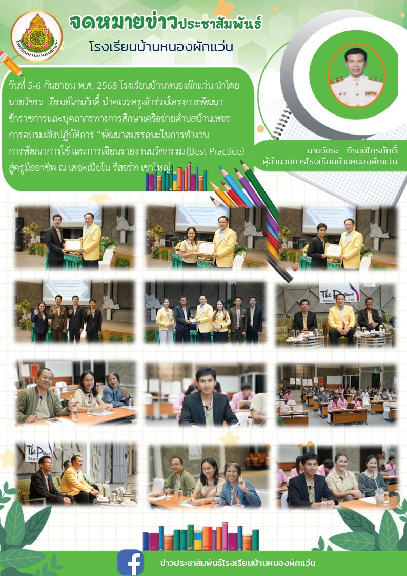 1 | วันที่ 5-6 กันยายน พ.ศ. 2568 โรงเรียนบ้านหนองผักแว่น นำโดย นายวัชระ ภิรมย์ไกรภักดิ์ นำคณะครูเข้าร่วมโครงการพัฒนาข้าราชการและบุคลากรทางการศึกษาเครือข่ายตำบลบ้านเพชร การอบรมเชิงปฏิบัติการ “พัฒนาสมรรถนะในการทำงาน การพัฒนาการใช้ และการเขียนรายงานนวัตกรรม (Best Practice) สู่ครูมืออาชีพ ณ เดอะเปียโน รีสอร์ท เขาใหญ่ |