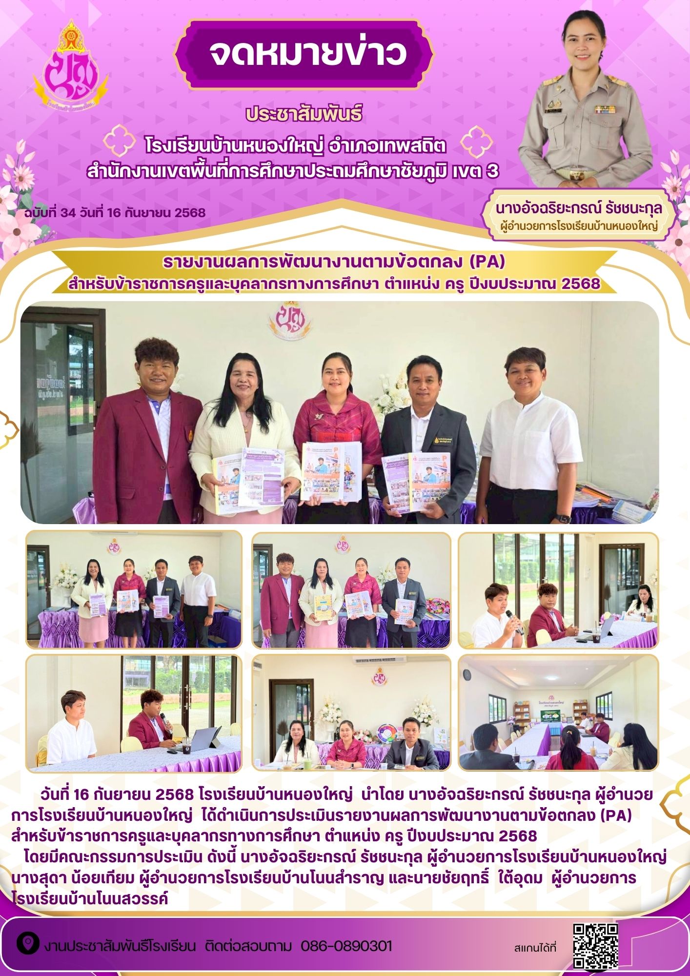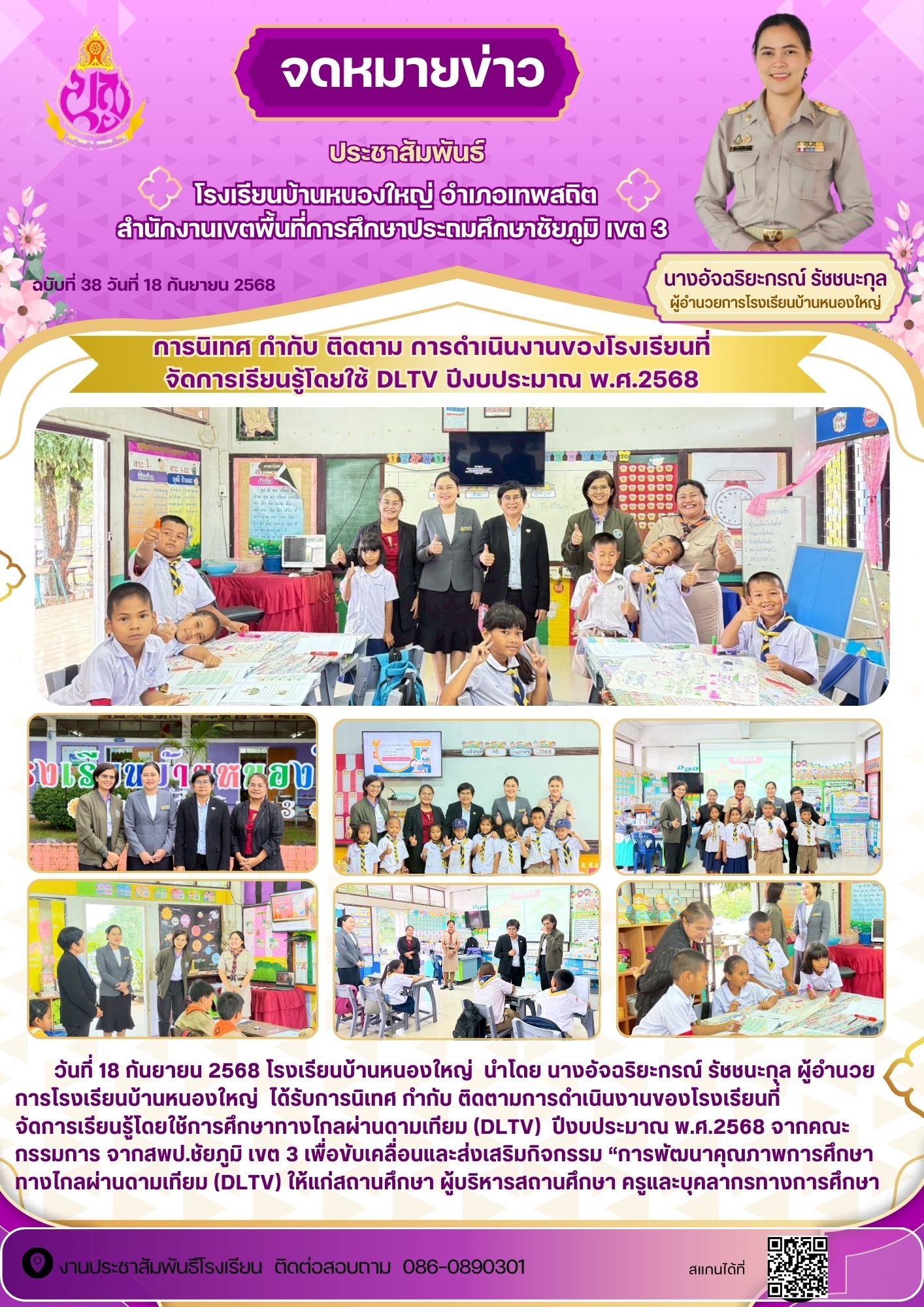 2 | นที่ 18 กันยายน 2568 โรงเรียนบ้านหนองใหญ่ นำโดย นางอัจฉริยะกรณ์ รัชชนะกุล ผู้อำนวยการโรงเรียนบ้านหนองใหญ่ ได้รับการนิเทศ กำกับ #ติดตามการดำเนินงานของโรงเรียนที่จัดการเรียนรู้โดยใช้การศึกษาทางไกลผ่านดามเทียม (DLTV) ปีงบประมาณ พ.ศ.2568 จากคณะกรรมการ จากสพป.ชัยภูมิ เขต 3 เพื่อขับเคลื่อนและส่งเสริมกิจกรรม “การพัฒนาคุณภาพการศึกษาทางไกลผ่านดามเทียม (DLTV) ให้แก่สถานศึกษา ผู้บริหารสถานศึกษา ครูและบุคลากรทางการศึกษา