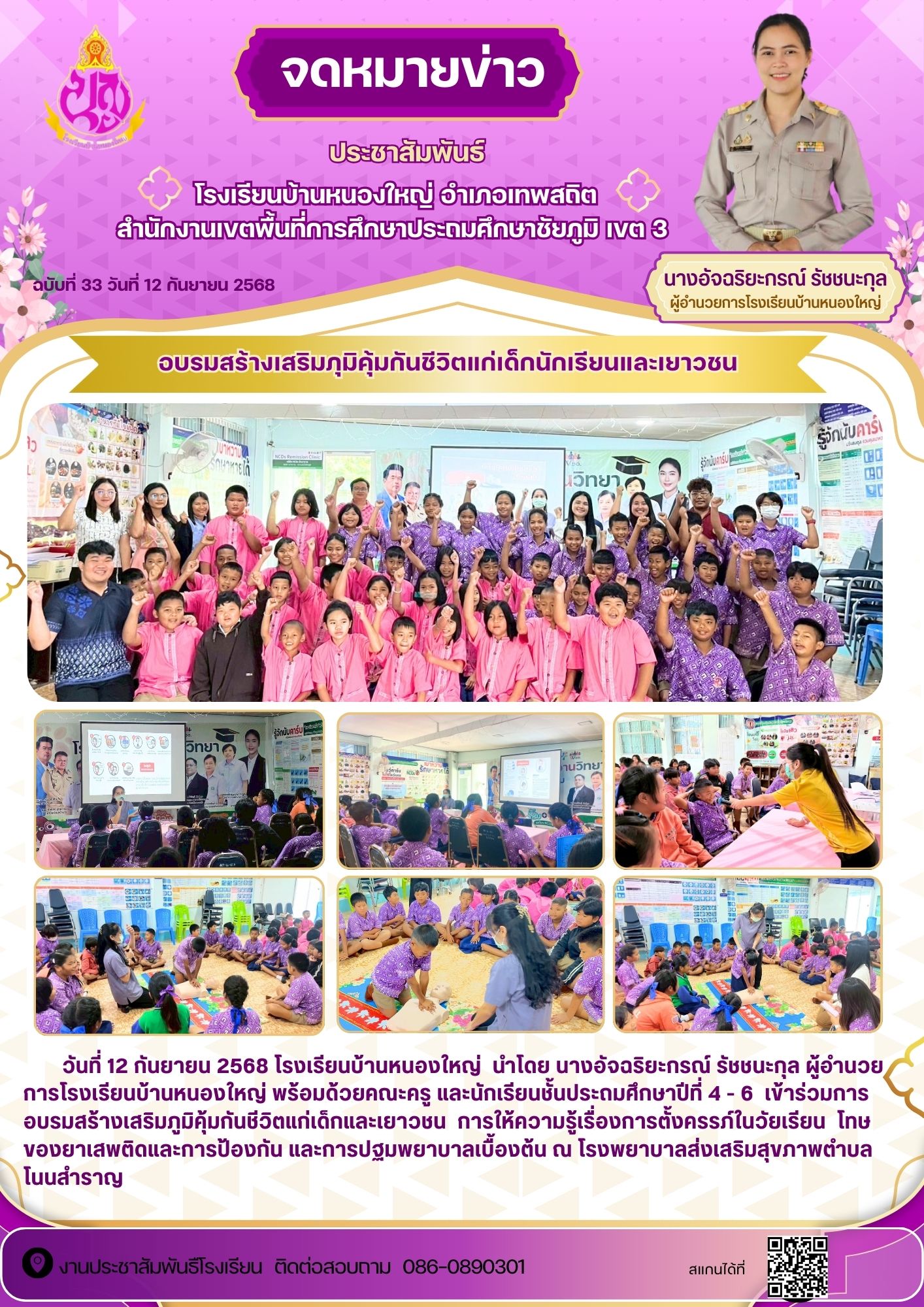 6 | การอบรมสร้างเสริมภูมิคุ้มกันชีวิตแก่เด็กและเยาวชน การให้ความรู้เรื่องการตั้งครรภ์ในวัยเรียน โทษของยาเสพติดและการป้องกัน และการปฐมพยาบาลเบื้องต้น ณ โรงพยาบาลส่งเสริมสุขภาพตำบลโนนสำราญ