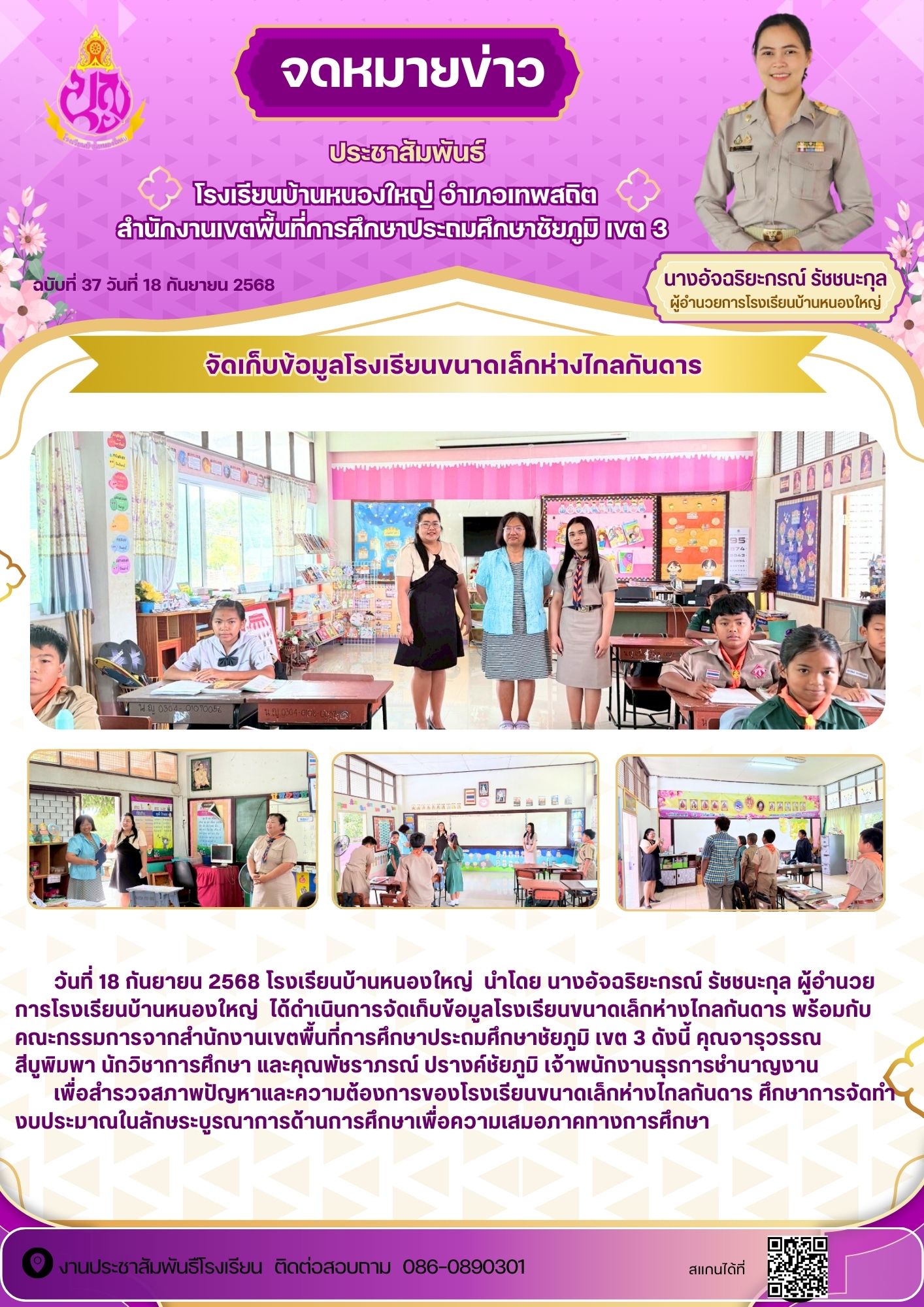 3 | วันที่ 18 กันยายน 2568 โรงเรียนบ้านหนองใหญ่ นำโดย นางอัจฉริยะกรณ์ รัชชนะกุล ผู้อำนวยการโรงเรียนบ้านหนองใหญ่ ได้ดำเนินการจัดเก็บข้อมูลโรงเรียนขนาดเล็กห่างไกลกันดาร พร้อมกับ คณะกรรมการจากสำนักงานเขตพื้นที่การศึกษาประถมศึกษาชัยภูมิ เขต 3 ดังนี้ คุณจารุวรรณ
