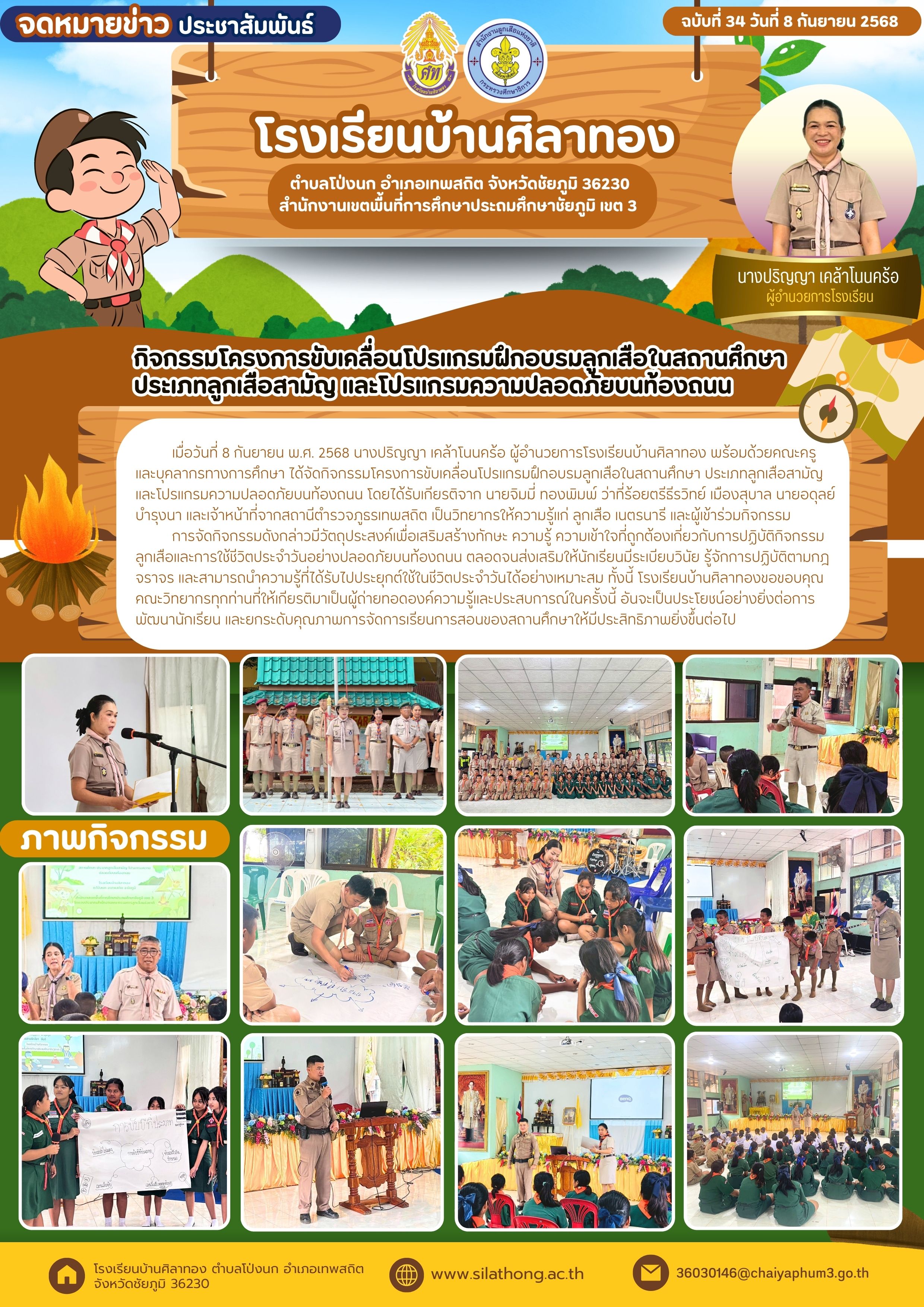 เมื่อวันที่ 8 กันยายน พ.ศ. 2568 นางปริญญา เคล้าโนนคร้อ ผู้อำนวยการโรงเรียนบ้านศิลาทอง พร้อมด้วยคณะครู และบุคลากรทางการศึกษา ได้จัดกิจกรรมโครงการขับเคลื่อนโปรแกรมฝึกอบรมลูกเสือในสถานศึกษา ประเภทลูกเสือสามัญ และโปรแกรมความปลอดภัยบนท้องถนน โดยได้รับเกียรติจาก นายจิมมี่ ทองพิมพ์ ว่าที่ร้อยตรีธีรวิทย์ เมืองสุบาล นายอดุลย์ บำรุงนา และเจ้าหน้าที่จากสถานีตำรวจภูธรเทพสถิต เป็นวิทยากรให้ความรู้แก่ ลูกเสือ เนตรนารี และผู้เข้าร่วมกิจกรรม