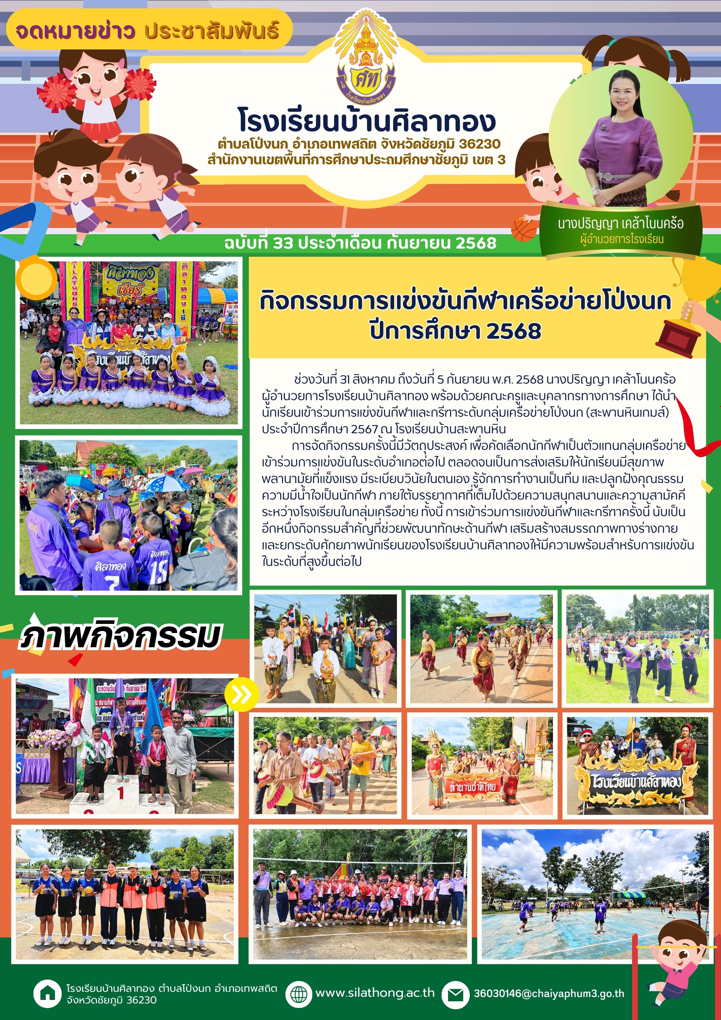 1 | ช่วงวันที่ 31 สิงหาคม ถึงวันที่ 5 กันยายน พ.ศ. 2568 นางปริญญา เคล้าโนนคร้อ ผู้อำนวยการโรงเรียนบ้านศิลาทอง พร้อมด้วยคณะครูและบุคลากรทางการศึกษา ได้นำนักเรียนเข้าร่วมการแข่งขันกีฬาและกรีฑาระดับกลุ่มเครือข่ายโป่งนก (สะพานหินเกมส์) ประจำปีการศึกษา 2567 ณ โรงเรียนบ้านสะพานหิน การจัดกิจกรรมครั้งนี้มีวัตถุประสงค์ เพื่อคัดเลือกนักกีฬาเป็นตัวแทนกลุ่มเครือข่ายเข้าร่วมการแข่งขันในระดับอำเภอต่อไป ตลอดจนเป็นการส่งเสริมให้นักเรียนมีสุขภาพพลานามัยที่แข็งแรง มีระเบียบวินัยในตนเอง รู้จักการทำงานเป็นทีม และปลูกฝังคุณธรรมความมีน้ำใจเป็นนักกีฬา ภายใต้บรรยากาศที่เต็มไปด้วยความสนุกสนานและความสามัคคีระหว่างโรงเรียนในกลุ่มเครือข่าย ทั้งนี้ การเข้าร่วมการแข่งขันกีฬาและกรีฑาครั้งนี้ นับเป็นอีกหนึ่งกิจกรรมสำคัญที่ช่วยพัฒนาทักษะด้านกีฬา เสริมสร้างสมรรถภาพทางร่างกาย และยกระดับศักยภาพนักเรียนของโรงเรียนบ้านศิลาทองให้มีความพร้อมสำหรับการแข่งขันในระดับที่สูงขึ้นต่อไป |