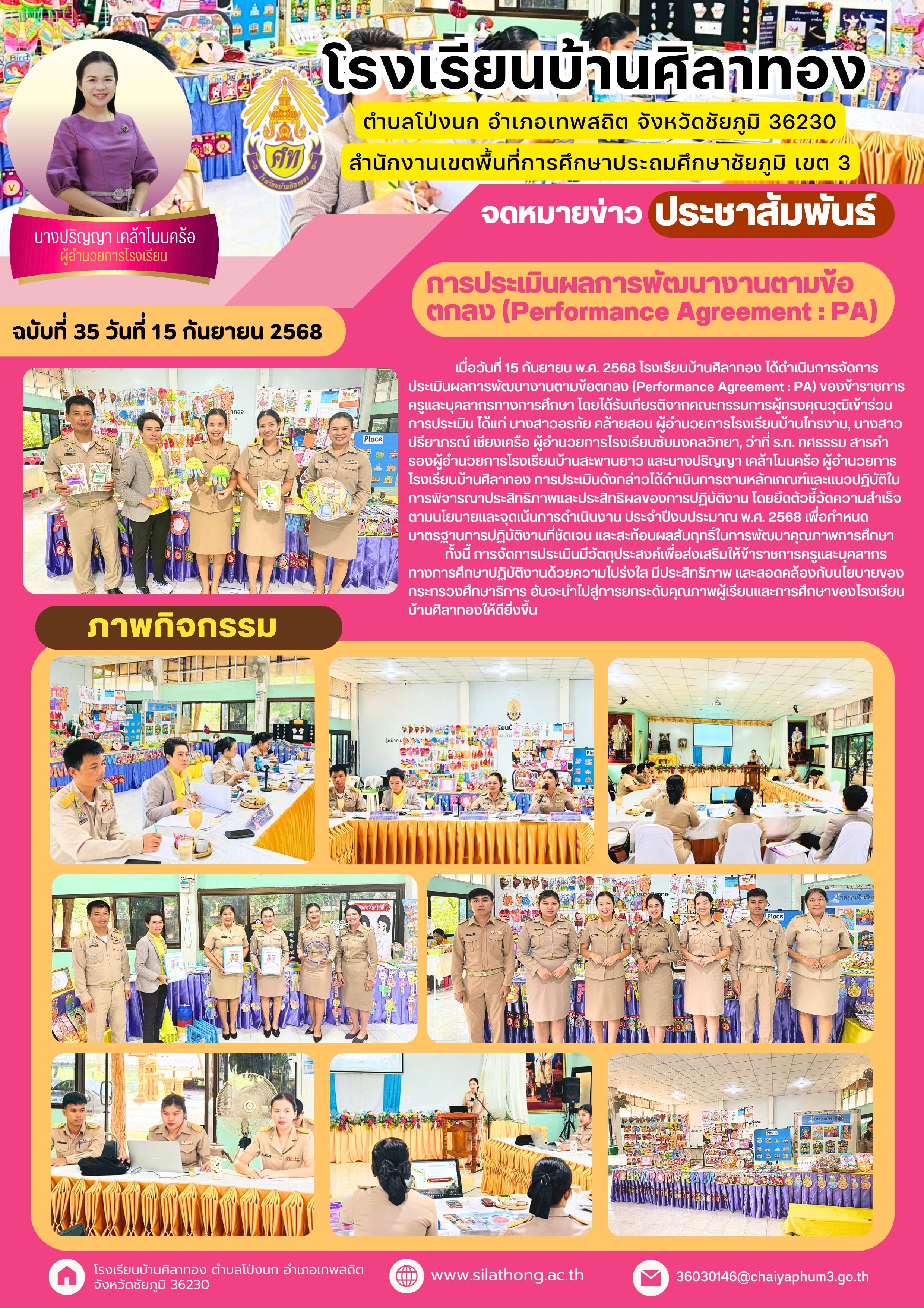 เมื่อวันที่ 15 กันยายน พ.ศ. 2568 โรงเรียนบ้านศิลาทอง ได้ดำเนินการจัดการประเมินผลการพัฒนางานตามข้อตกลง (Performance Agreement : PA) ของข้าราชการครูและบุคลากรทางการศึกษา โดยได้รับเกียรติจากคณะกรรมการผู้ทรงคุณวุฒิเข้าร่วมการประเมิน ได้แก่ นางสาวอรทัย คล้ายสอน ผู้อำนวยการโรงเรียนบ้านไทรงาม, นางสาวปรียาภรณ์ เชียงเครือ ผู้อำนวยการโรงเรียนซับมงคลวิทยา, ว่าที่ ร.ท. ทศธรรม สารคำ รองผู้อำนวยการโรงเรียนบ้านสะพานยาว และนางปริญญา เคล้าโนนคร้อ ผู้อำนวยการโรงเรียนบ้านศิลาทอง การประเมินดังกล่าวได้ดำเนินการตามหลักเกณฑ์และแนวปฏิบัติในการพิจารณาประสิทธิภาพและประสิทธิผลของการปฏิบัติงาน โดยยึดตัวชี้วัดความสำเร็จตามนโยบายและจุดเน้นการดำเนินงาน ประจำปีงบประมาณ พ.ศ. 2568 เพื่อกำหนดมาตรฐานการปฏิบัติงานที่ชัดเจน และสะท้อนผลสัมฤทธิ์ในการพัฒนาคุณภาพการศึกษา