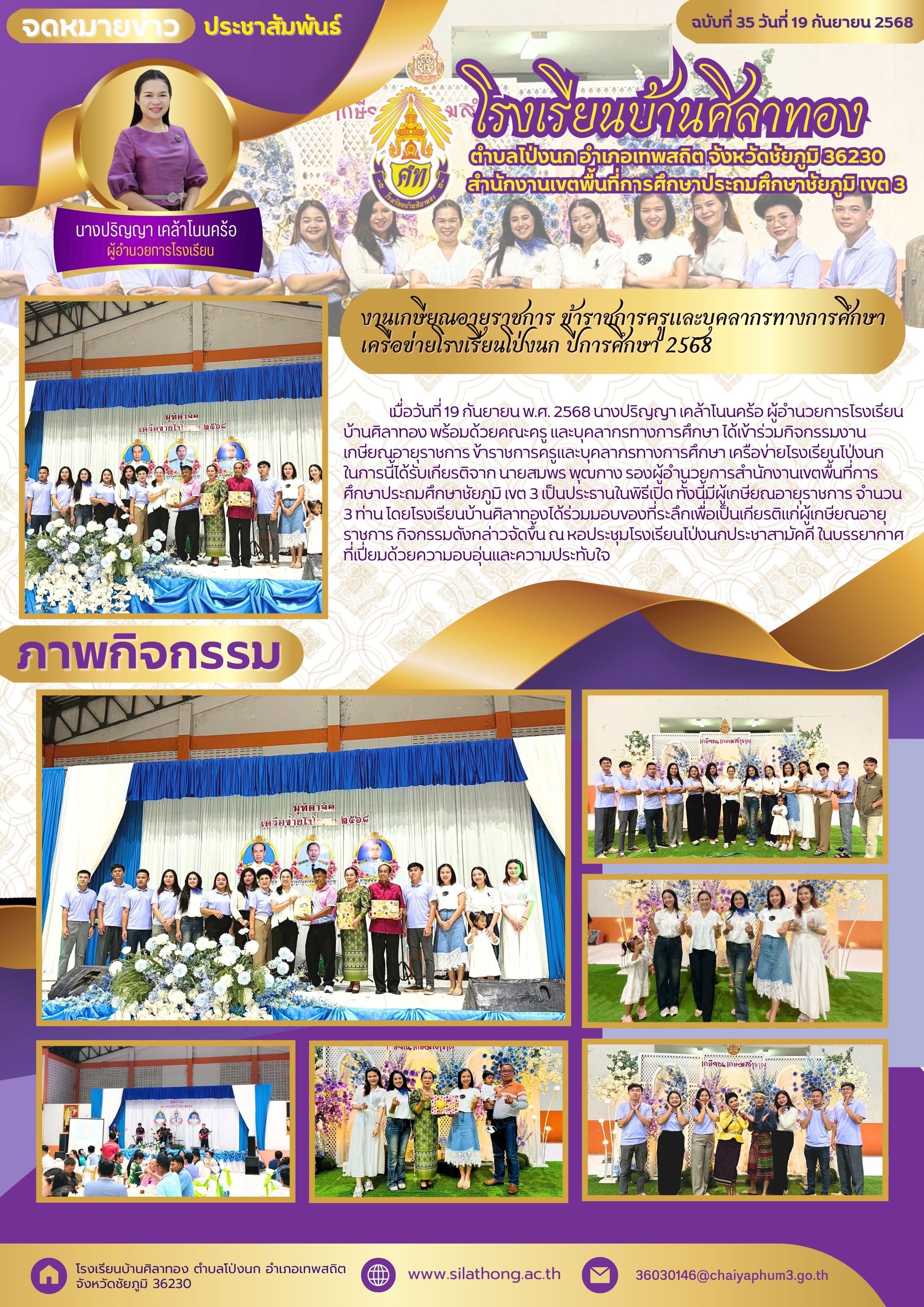 เมื่อวันที่ 19 กันยายน พ.ศ. 2568 นางปริญญา เคล้าโนนคร้อ ผู้อำนวยการโรงเรียนบ้านศิลาทอง พร้อมด้วยคณะครู และบุคลากรทางการศึกษา ได้เข้าร่วมกิจกรรมงานเกษียณอายุราชการ ข้าราชการครูและบุคลากรทางการศึกษา เครือข่ายโรงเรียนโป่งนก