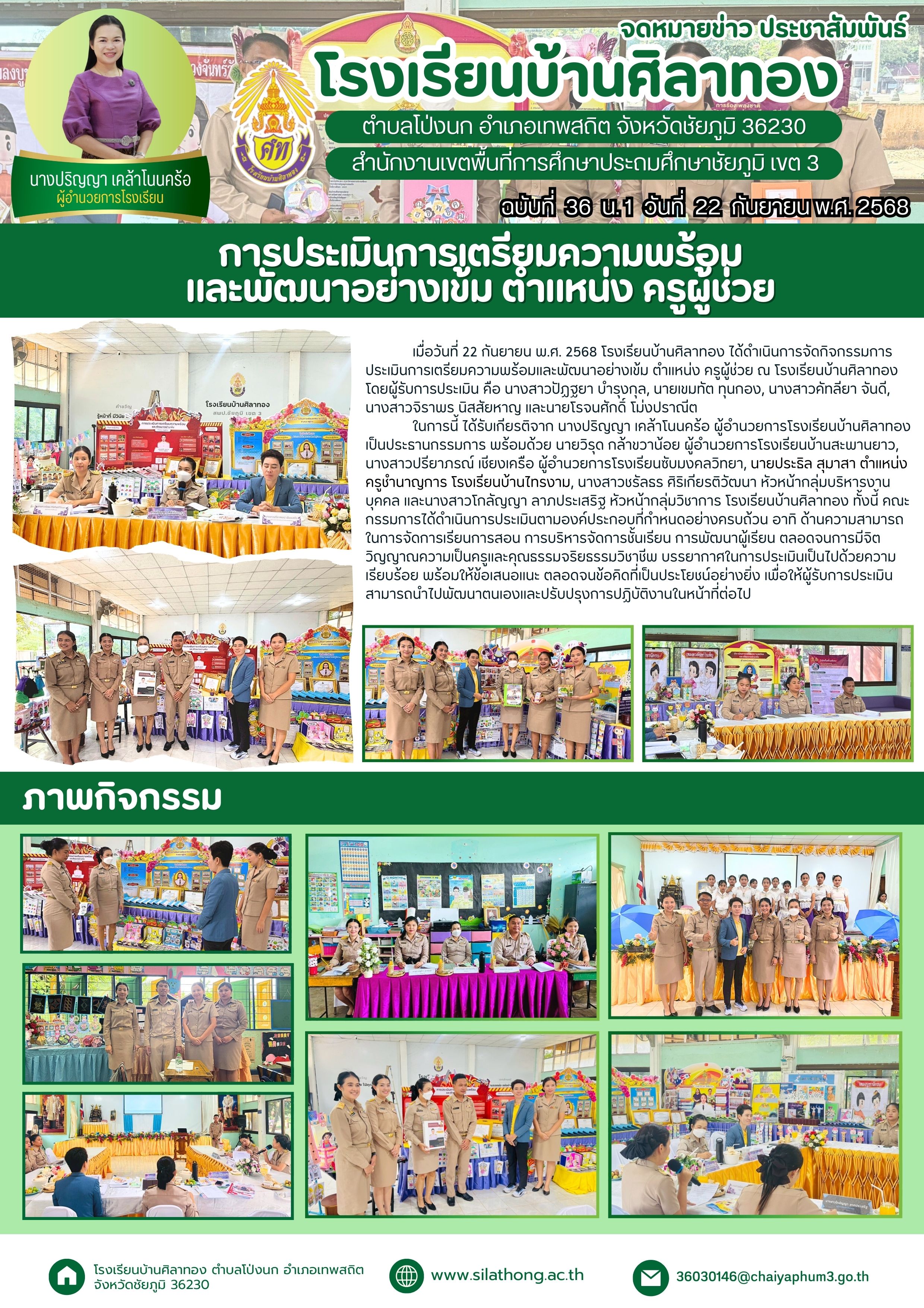 เมื่อวันที่ 22 กันยายน พ.ศ. 2568 โรงเรียนบ้านศิลาทอง ได้ดำเนินการจัดกิจกรรมการประเมินการเตรียมความพร้อมและพัฒนาอย่างเข้ม ตำแหน่ง ครูผู้ช่วย ณ โรงเรียนบ้านศิลาทอง โดยผู้รับการประเมิน คือ นางสาวปัฏฐยา บำรุงกุล, นายเขมทัต ทุนกอง, นางสาวคัทลียา จันดี, นางสาวจิราพร นิสสัยหาญ และนายโรจนศักดิ์ โม่งปราณีต