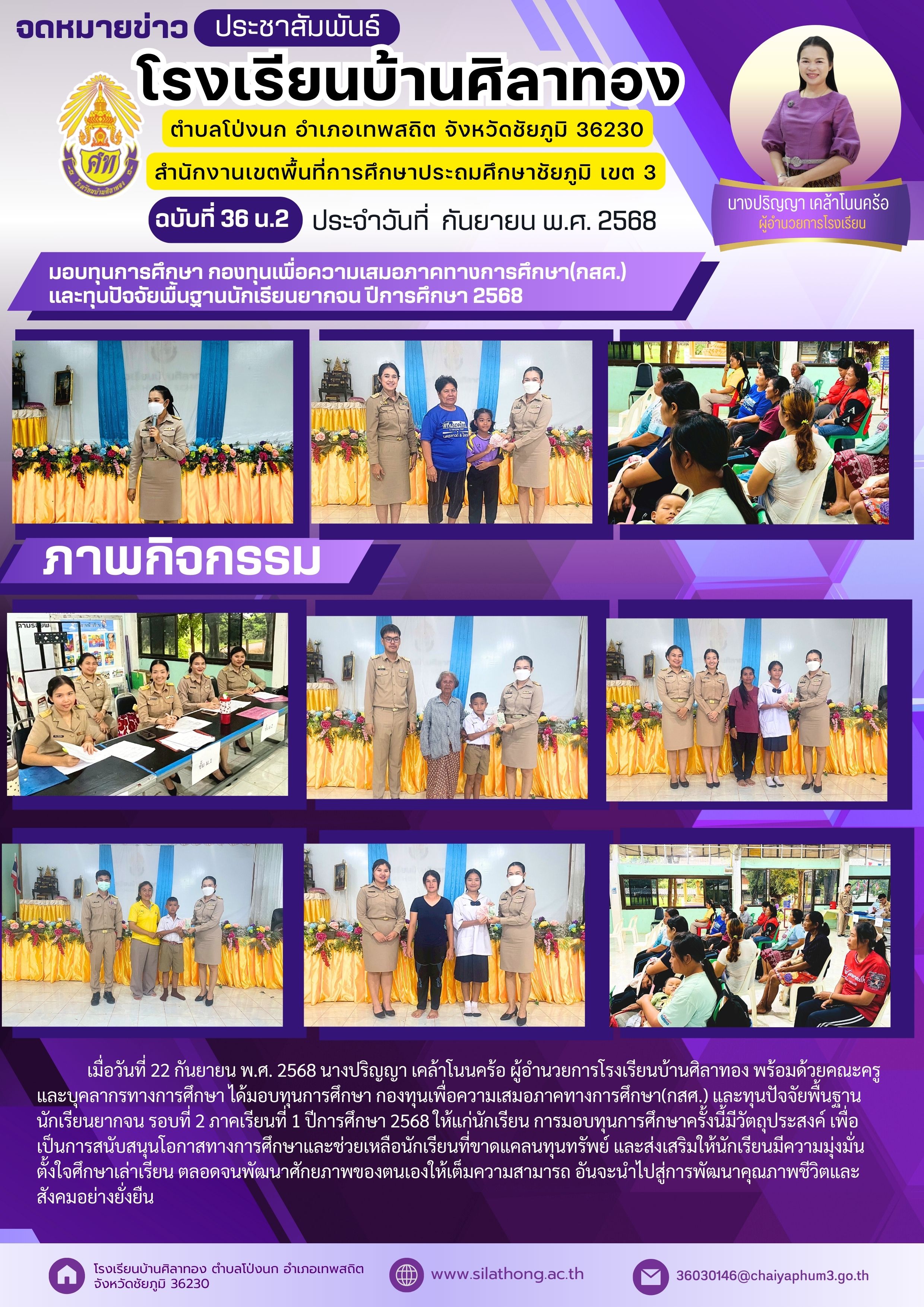 6 | เมื่อวันที่ 22 กันยายน พ.ศ. 2568 นางปริญญา เคล้าโนนคร้อ ผู้อำนวยการโรงเรียนบ้านศิลาทอง พร้อมด้วยคณะครูและบุคลากรทางการศึกษา ได้มอบทุนการศึกษา กองทุนเพื่อความเสมอภาคทางการศึกษา(กสศ.) และทุนปัจจัยพื้นฐานนักเรียนยากจน รอบที่ 2 ภาคเรียนที่ 1 ปีการศึกษา 2568 ให้แก่นักเรียน การมอบทุนการศึกษาครั้งนี้มีวัตถุประสงค์ เพื่อเป็นการสนับสนุนโอกาสทางการศึกษาและช่วยเหลือนักเรียนที่ขาดแคลนทุนทรัพย์ และส่งเสริมให้นักเรียนมีความมุ่งมั่นตั้งใจศึกษาเล่าเรียน ตลอดจนพัฒนาศักยภาพของตนเองให้เต็มความสามารถ อันจะนำไปสู่การพัฒนาคุณภาพชีวิตและสังคมอย่างยั่งยืน |