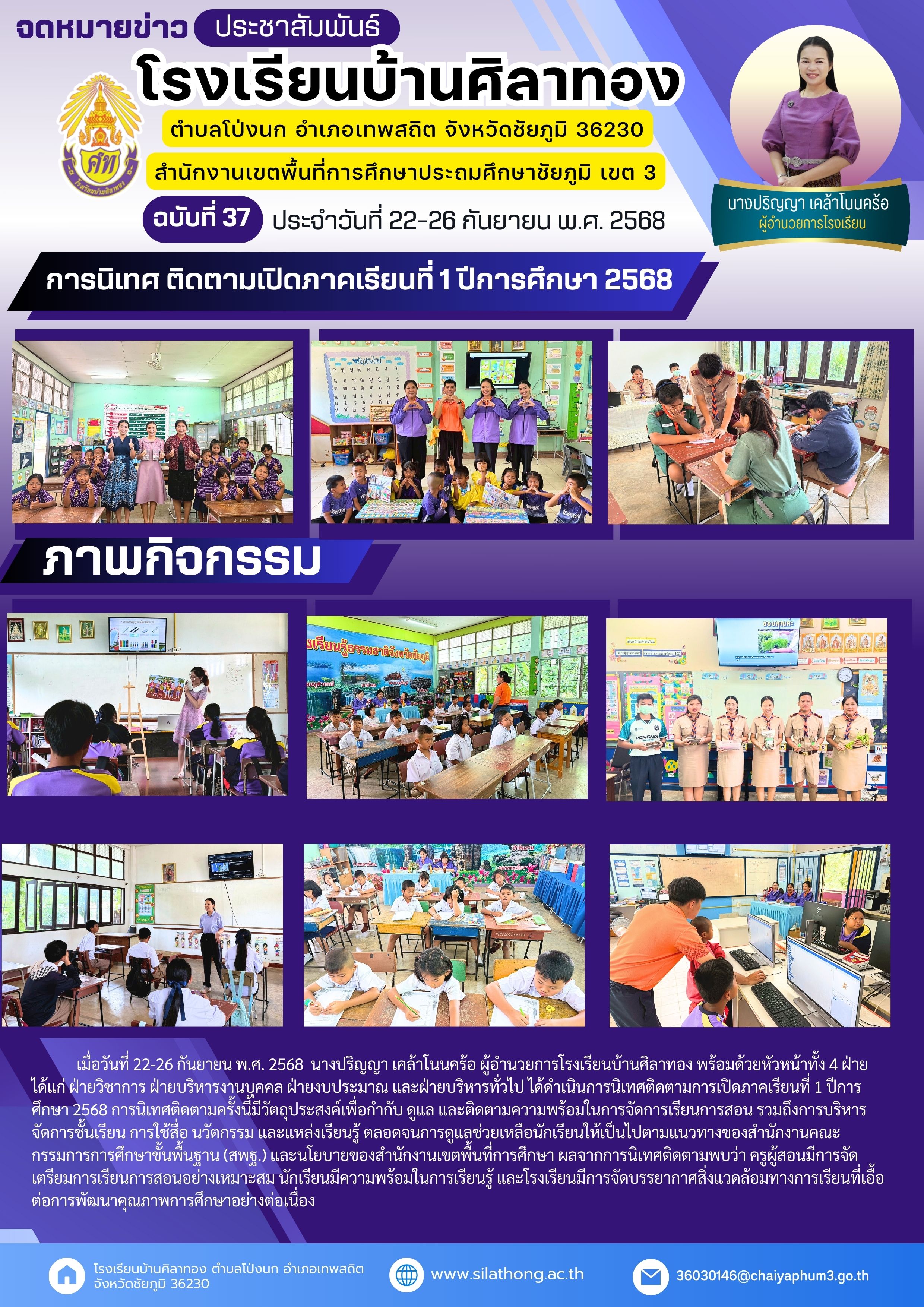 7 | เมื่อวันที่ 22-26 กันยายน พ.ศ. 2568 นางปริญญา เคล้าโนนคร้อ ผู้อำนวยการโรงเรียนบ้านศิลาทอง พร้อมด้วยหัวหน้าทั้ง 4 ฝ่าย ได้แก่ ฝ่ายวิชาการ ฝ่ายบริหารงานบุคคล ฝ่ายงบประมาณ และฝ่ายบริหารทั่วไป ได้ดำเนินการนิเทศติดตามการเปิดภาคเรียนที่ 1 ปีการศึกษา 2568 การนิเทศติดตามครั้งนี้มีวัตถุประสงค์เพื่อกำกับ ดูแล และติดตามความพร้อมในการจัดการเรียนการสอน รวมถึงการบริหารจัดการชั้นเรียน การใช้สื่อ นวัตกรรม และแหล่งเรียนรู้ ตลอดจนการดูแลช่วยเหลือนักเรียนให้เป็นไปตามแนวทางของสำนักงานคณะกรรมการการศึกษาขั้นพื้นฐาน (สพฐ.) และนโยบายของสำนักงานเขตพื้นที่การศึกษา ผลจากการนิเทศติดตามพบว่า ครูผู้สอนมีการจัดเตรียมการเรียนการสอนอย่างเหมาะสม นักเรียนมีความพร้อมในการเรียนรู้ และโรงเรียนมีการจัดบรรยากาศสิ่งแวดล้อมทางการเรียนที่เอื้อต่อการพัฒนาคุณภาพการศึกษาอย่างต่อเนื่อง