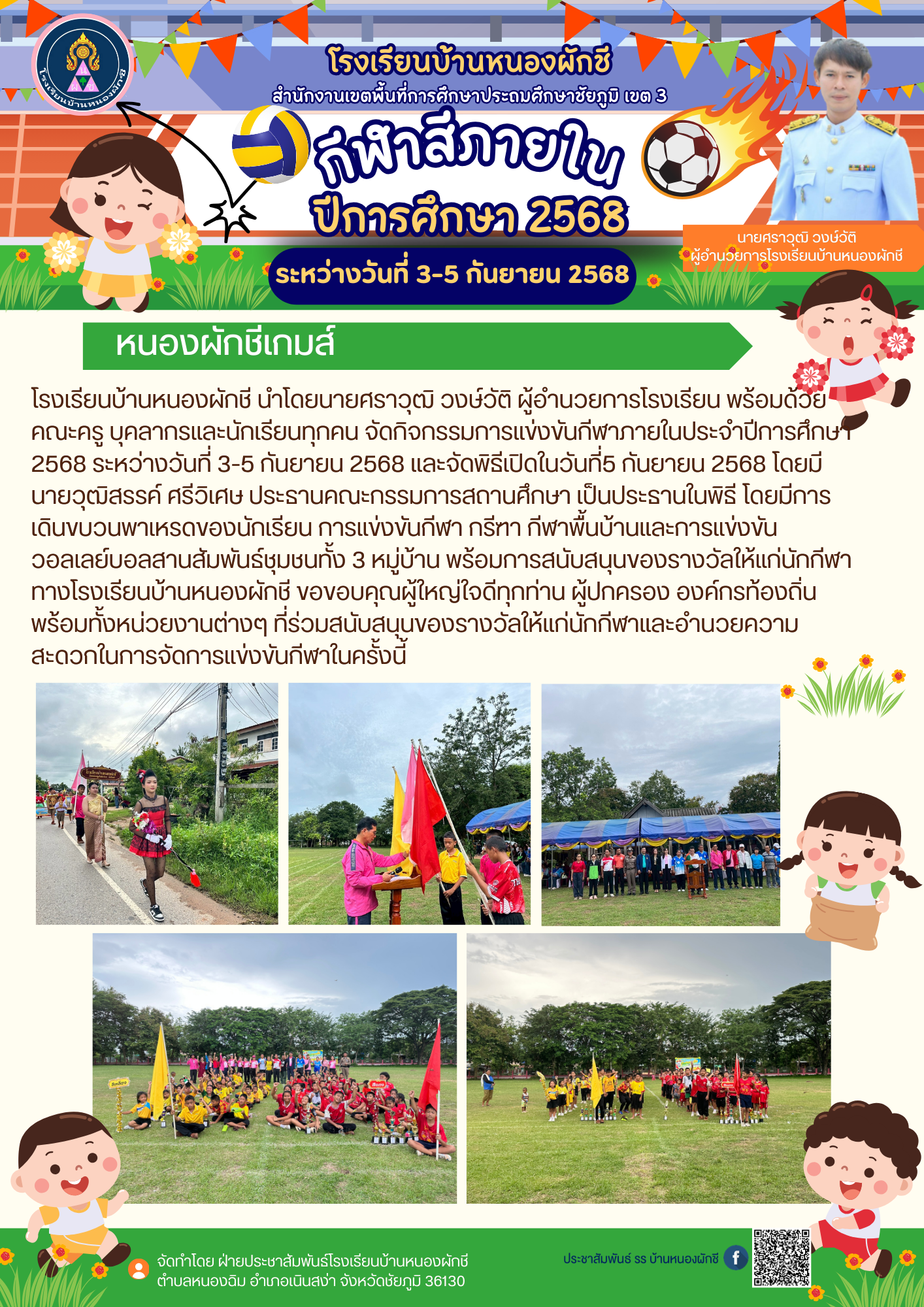 1 | โรงเรียนบ้านหนองผักชี นำโดยนายศราวุฒิ วงษ์วัติ ผู้อำนวยการโรงเรียน พร้อมด้วยคณะครู บุคลากรและนักเรียนทุกคน จัดกิจกรรมการแข่งขันกีฬาภายในประจำปีการศึกษา 2568 ระหว่างวันที่ 3-5 กันยายน 2568 และจัดพิธีเปิดในวันที่5 กันยายน 2568 โดยมีนายวุฒิสรรค์ ศรีวิเศษ ประธานคณะกรรมการสถานศึกษา เป็นประธานในพิธี โดยมีการเดินขบวนพาเหรดของนักเรียน การแข่งขันกีฬา กรีฑา กีฬาพื้นบ้านและการแข่งขันวอลเลย์บอลสานสัมพันธ์ชุมชนทั้ง 3 หมู่บ้าน พร้อมการสนับสนุนของรางวัลให้แก่นักกีฬา ทางโรงเรียนบ้านหนองผักชี ขอขอบคุณผู้ใหญ่ใจดีทุกท่าน ผู้ปกครอง องค์กรท้องถิ่น พร้อมทั้งหน่วยงานต่างๆ ที่ร่วมสนับสนุนของรางวัลให้แก่นักกีฬาและอำนวยความสะดวกในการจัดการแข่งขันกีฬาในครั้งนี้