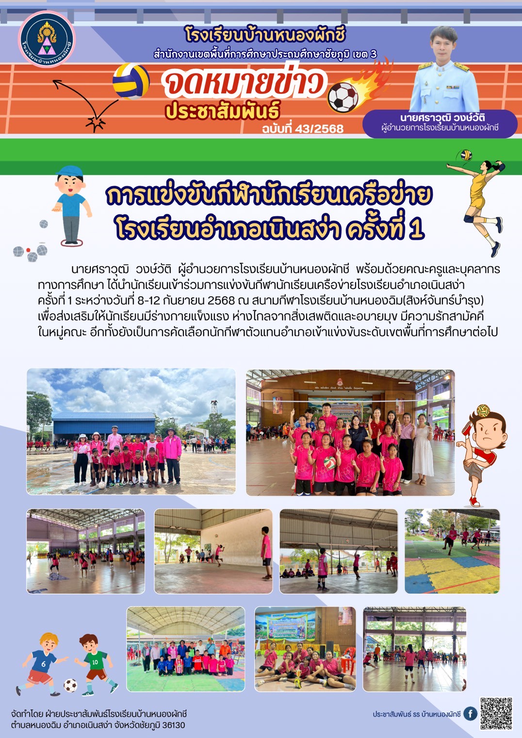 2 | นายศราวุฒิ วงษ์วัติ ผู้อำนวยการโรงเรียนบ้านหนองผักชี พร้อมด้วยคณะครูและบุคลากรทางการศึกษา ได้นำนักเรียนเข้าร่วมการแข่งขันกีฬานักเรียนเครือข่ายโรงเรียนอำเภอเนินสง่าครั้งที่ 1 ระหว่างวันที่ 8-12 กันยายน 2568 ณ สนามกีฬาโรงเรียนบ้านหนองฉิม(สิงห์จันทร์บำรุง)เพื่อส่งเสริมให้นักเรียนมีร่างกายแข็งแรง ห่างไกลจากสิ่งเสพติดและอบายมุข มีความรักสามัคคีในหมู่คณะ อีกทั้งยังเป็นการคัดเลือกนักกีฬาตัวแทนอำเภอเข้าแข่งขันระดับเขตพื้นที่การศึกษาต่อไป |