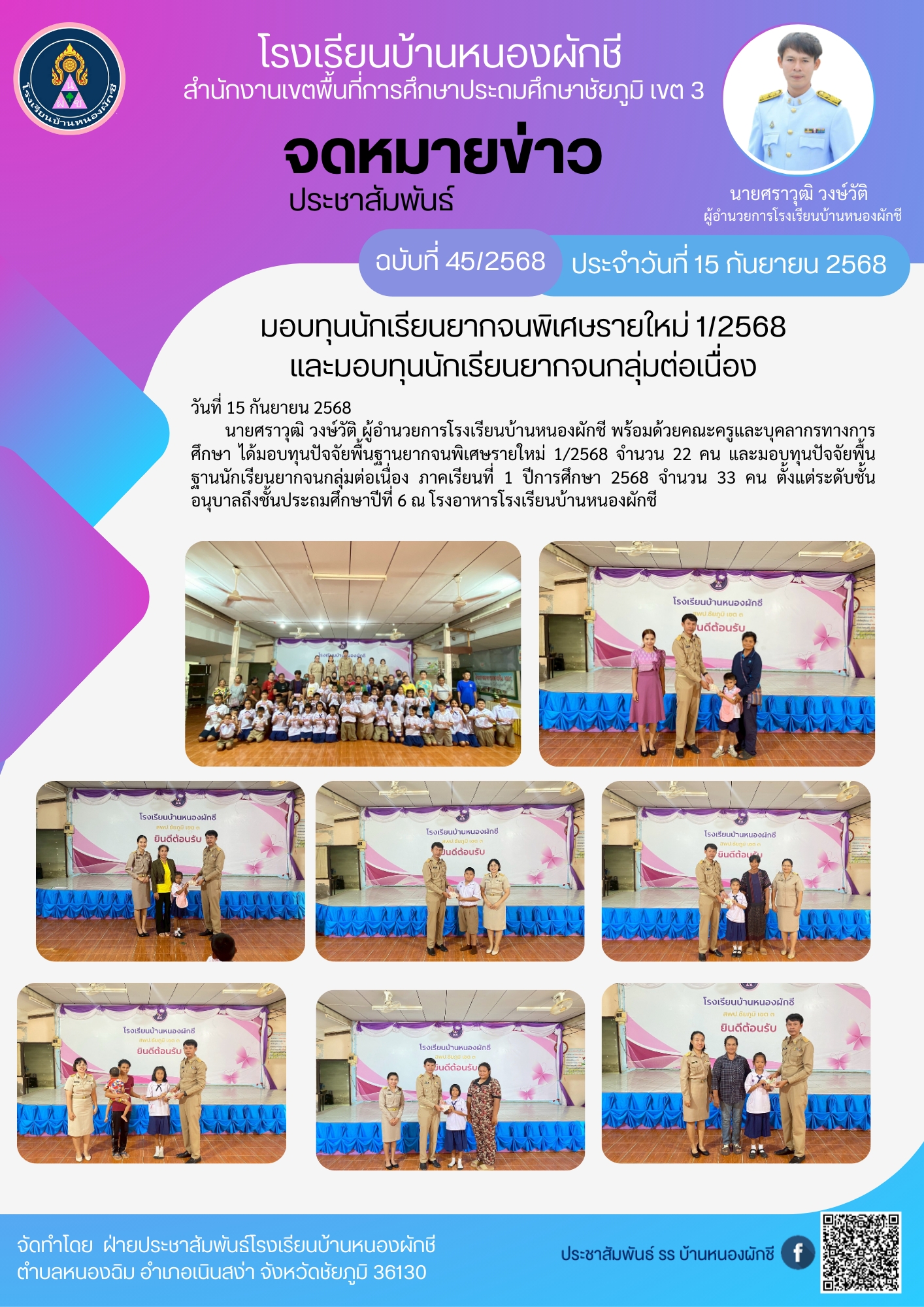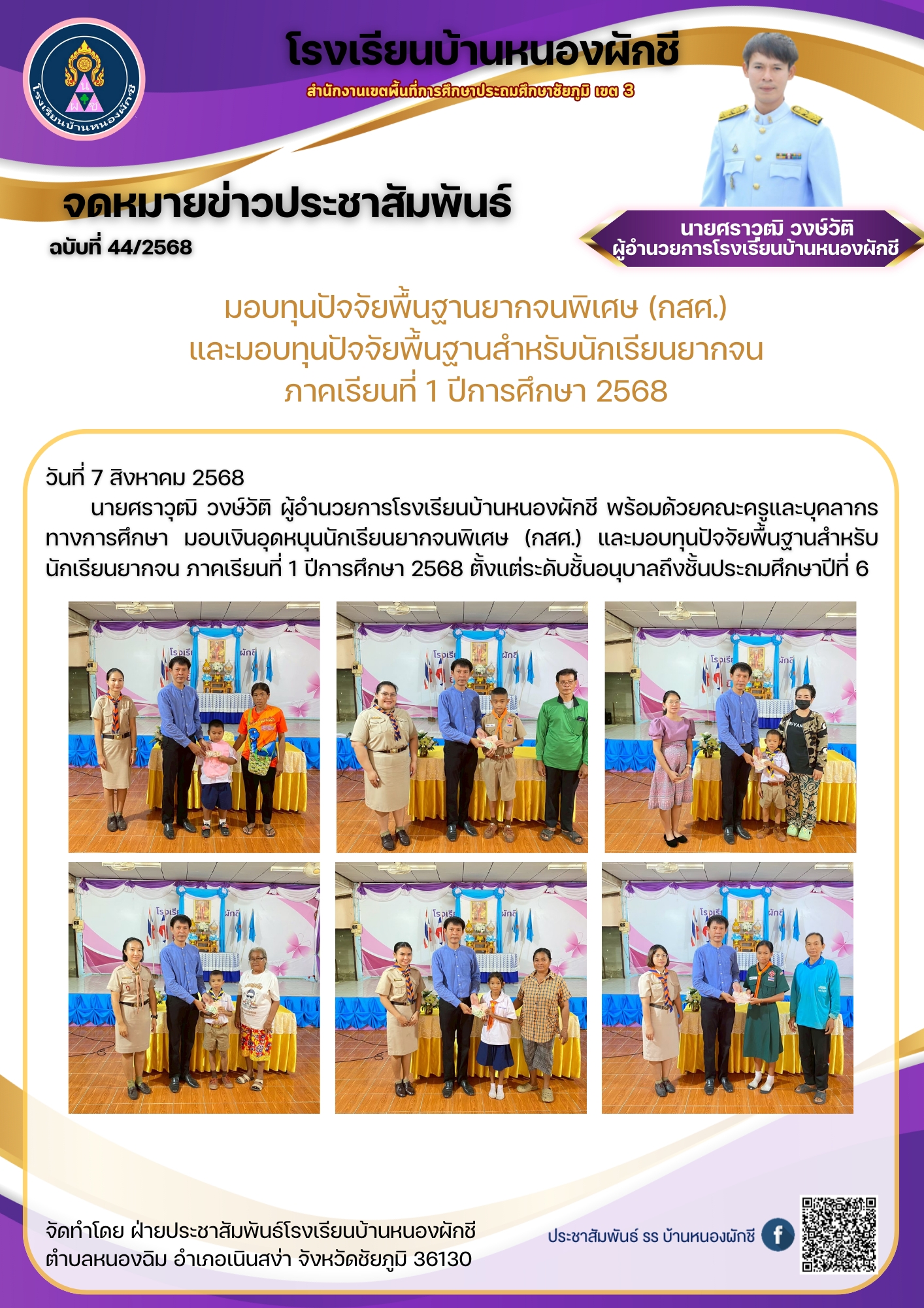 นายศราวุฒิ วงษ์วัติ ผู้อำนวยการโรงเรียนบ้านหนองผักชี พร้อมด้วยคณะครูและบุคลากรทางการศึกษา ได้มอบทุนปัจจัยพื้นฐานยากจนพิเศษรายใหม่ 1/2568 จำนวน 22 คน และมอบทุนปัจจัยพื้นฐานนักเรียนยากจนกลุ่มต่อเนื่อง ภาคเรียนที่ 1 ปีการศึกษา 2568 จำนวน 33 คน ตั้งแต่ระดับชั้นอนุบาลถึงชั้นประถมศึกษาปีที่ 6 ณ โรงอาหารโรงเรียนบ้านหนองผักชี