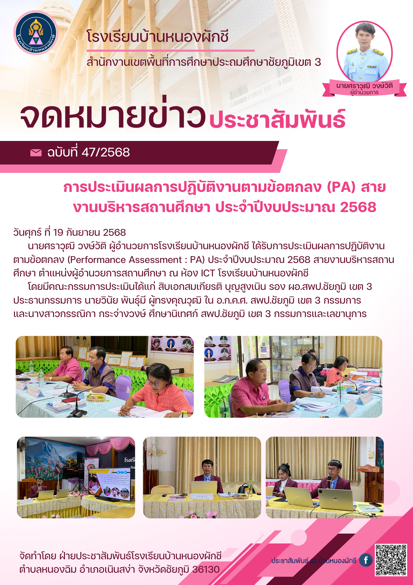 5 | วันศุกร์ ที่ 19 กันยายน 2568 นายศราวุฒิ วงษ์วัติ ผู้อำนวยการโรงเรียนบ้านหนองผักชี ได้รับการประเมินผลการปฏิบัติงานตามข้อตกลง (Performance Assessment : PA) ประจำปีงบประมาณ 2568 สายงานบริหารสถานศึกษา ตำแหน่งผู้อำนวยการสถานศึกษา ณ ห้อง ICT โรงเรียนบ้านหนองผักชี โดยมีคณะกรรมการประเมินได้แก่ สิบเอกสมเกียรติ บุญสูงเนิน รอง ผอ.สพป.ชัยภูมิ เขต 3 ประธานกรรมการ นายวินัย พันธุ์มี ผู้ทรงคุณวุฒิ ใน อ.ก.ค.ศ. สพป.ชัยภูมิ เขต 3 กรรมการ และนางสาวกรรณิกา กระจ่างวงษ์ ศึกษานิเทศก์ สพป.ชัยภูมิ เขต 3 กรรมการและเลขานุการ |