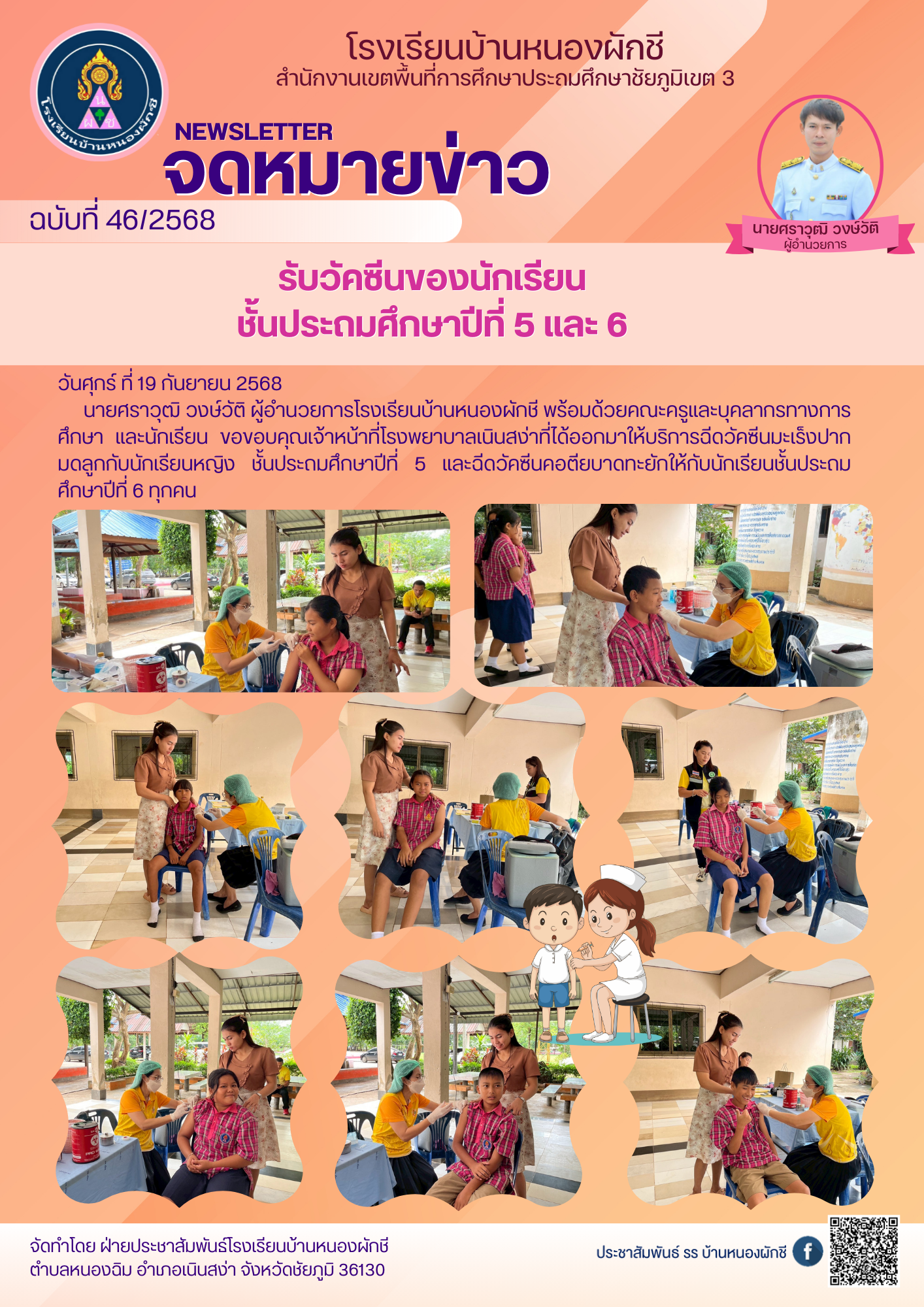 6 | วันศุกร์ ที่ 19 กันยายน 2568 นายศราวุฒิ วงษ์วัติ ผู้อำนวยการโรงเรียนบ้านหนองผักชี พร้อมด้วยคณะครูและบุคลากรทางการศึกษา และนักเรียน ขอขอบคุณเจ้าหน้าที่โรงพยาบาลเนินสง่าที่ได้ออกมาให้บริการฉีดวัคซีนมะเร็งปากมดลูกกับนักเรียนหญิง ชั้นประถมศึกษาปีที่ 5 และฉีดวัคซีนคอตียบาดทะยักให้กับนักเรียนชั้นประถมศึกษาปีที่ 6 ทุกคน |