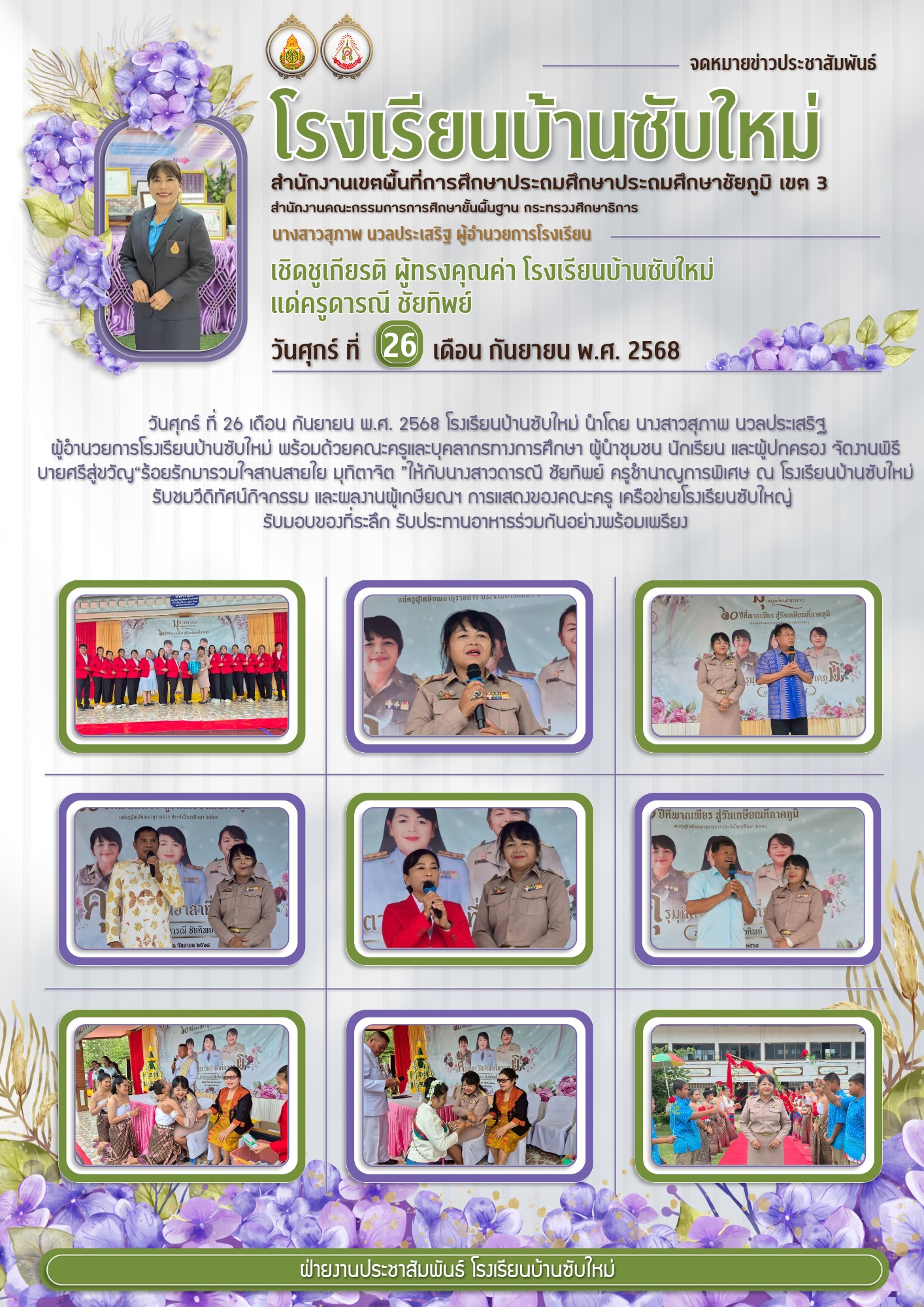 ผู้อำนวยการโรงเรียนบ้านซับใหม่ พร้อมด้วยคณะครูและบุคลากรทางการศึกษา ผู้นำชุมชน นักเรียน และผู้ปกครอง จัดงานพิธีบายศรีสู่ขวัญ“ร้อยรักมารวมใจสานสายใย มุทิตาจิต ”ให้กับนางสาวดารณี ชัยทิพย์ ครูชำนาญการพิเศษ ณ โรงเรียนบ้านซับใหม่ รับชมวีดิทัศน์กิจกรรม และผลงานผู้เกษียณฯ การแสดงของคณะครู เครือข่ายโรงเรียนซับใหญ่ รับมอบของที่ระลึก รับประทานอาหารร่วมกันอย่างพร้อมเพรียง |