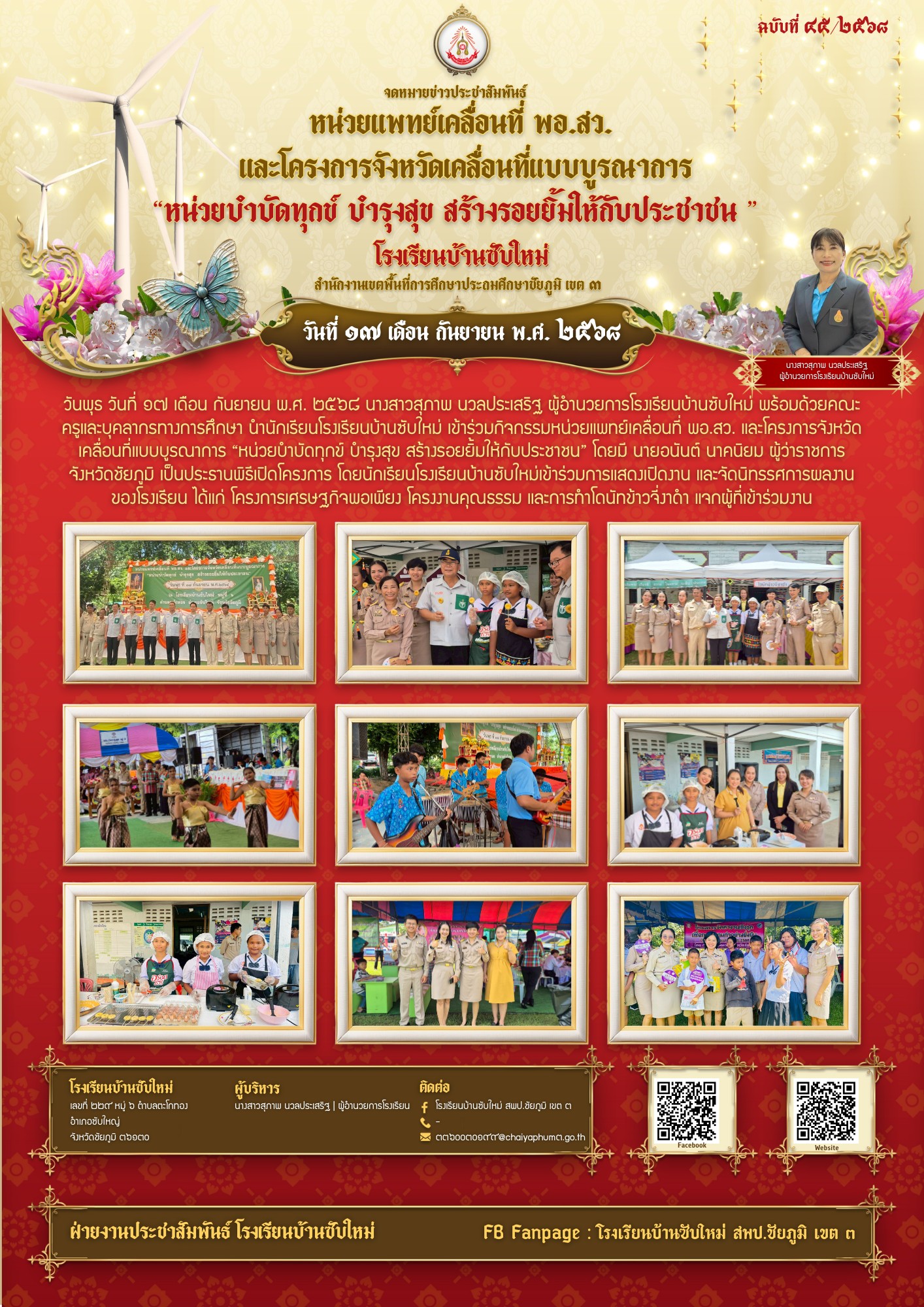 3 | วันพุธ วันที่ ๑๗ เดือน กันยายน พ.ศ. ๒๕๖๘ นางสาวสุภาพ นวลประเสริฐ ผู้อำนวยการโรงเรียนบ้านซับใหม่ พร้อมด้วยคณะครูและบุคลากรทางการศึกษา นำนักเรียนโรงเรียนบ้านซับใหม่ เข้าร่วมกิจกรรมหน่วยแพทย์เคลื่อนที่ พอ.สว. และโครงการจังหวัดเคลื่อนที่แบบบูรณาการ “หน่วยบำบัดทุกข์ บำรุงสุข สร้างรอยยิ้มให้กับประชาชน” โดยมี นายอนันต์ นาคนิยม ผู้ว่าราชการจังหวัดชัยภูมิ เป็นประธานพิธีเปิดโครงการ โดยนักเรียนโรงเรียนบ้านซับใหม่เข้าร่วมการแสดงเปิดงาน และจัดนิทรรศการผลงานของโรงเรียน ได้แก่ โครงการเศรษฐกิจพอเพียง โครงงานคุณธรรม และการทำโดนัทข้าวจี่งาดำ แจกผู้ที่เข้าร่วมงาน