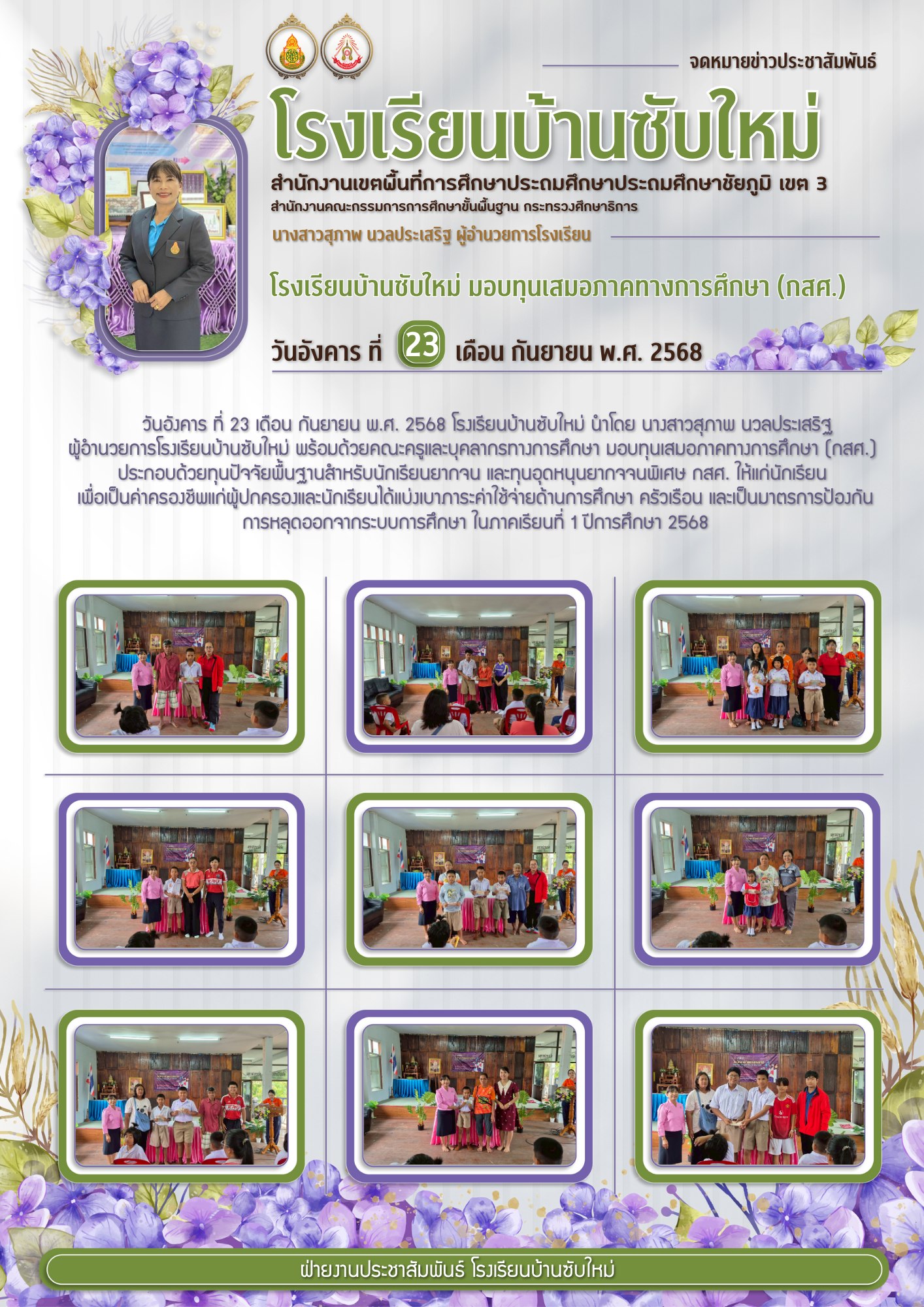 5 | วันจันทร์ ที่ 18 เดือน กันยายน พ.ศ. 2568 นางสาวสุภาพ นวลประเสริฐ ผู้อำนวยการโรงเรียนบ้านซับใหม่