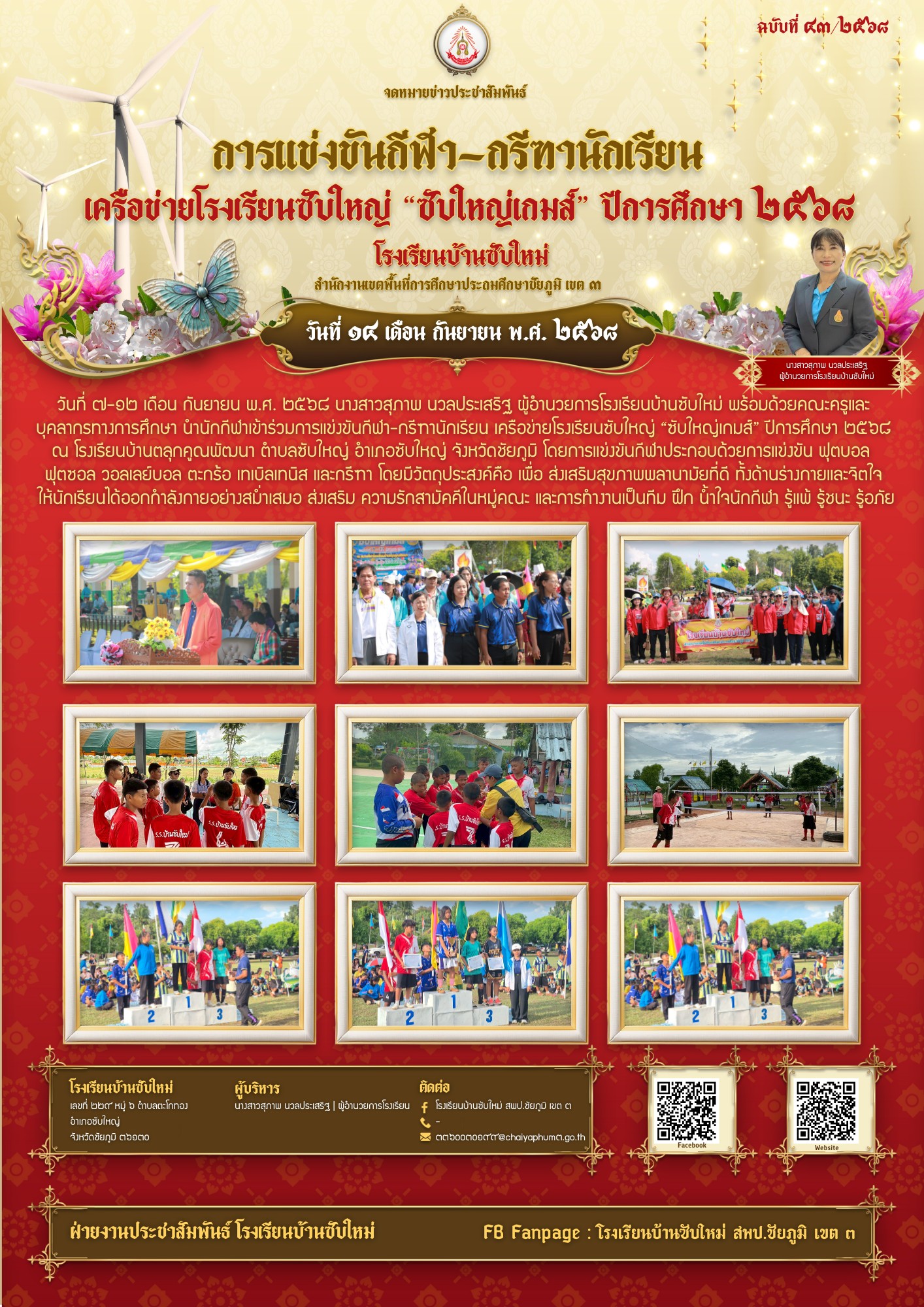 1 | วันที่ ๗-๑๒ เดือน กันยายน พ.ศ. ๒๕๖๘ นางสาวสุภาพ นวลประเสริฐ ผู้อำนวยการโรงเรียนบ้านซับใหม่ พร้อมด้วยคณะครูและบุคลากรทางการศึกษา นำนักกีฬาเข้าร่วมการแข่งขันกีฬา-กรีฑานักเรียน เครือข่ายโรงเรียนซับใหญ่ “ซับใหญ่เกมส์” ปีการศึกษา ๒๕๖๘ ณ โรงเรียนบ้านตลุกคูณพัฒนา ตำบลซับใหญ่ อำเภอซับใหญ่ จังหวัดชัยภูมิ โดยการแข่งขันกีฬาประกอบด้วยการแข่งขัน ฟุตบอล ฟุตซอล วอลเลย์บอล ตะกร้อ เทเบิลเทนิส และกรีฑา โดยมีวัตถุประสงค์คือ เพื่อ ส่งเสริมสุขภาพพลานามัยที่ดี ทั้งด้านร่างกายและจิตใจ ให้นักเรียนได้ออกกำลังกายอย่างสม่ำเสมอ ส่งเสริม ความรักสามัคคีในหมู่คณะ และการทำงานเป็นทีม ฝึก น้ำใจนักกีฬา รู้แพ้ รู้ชนะ รู้อภัย