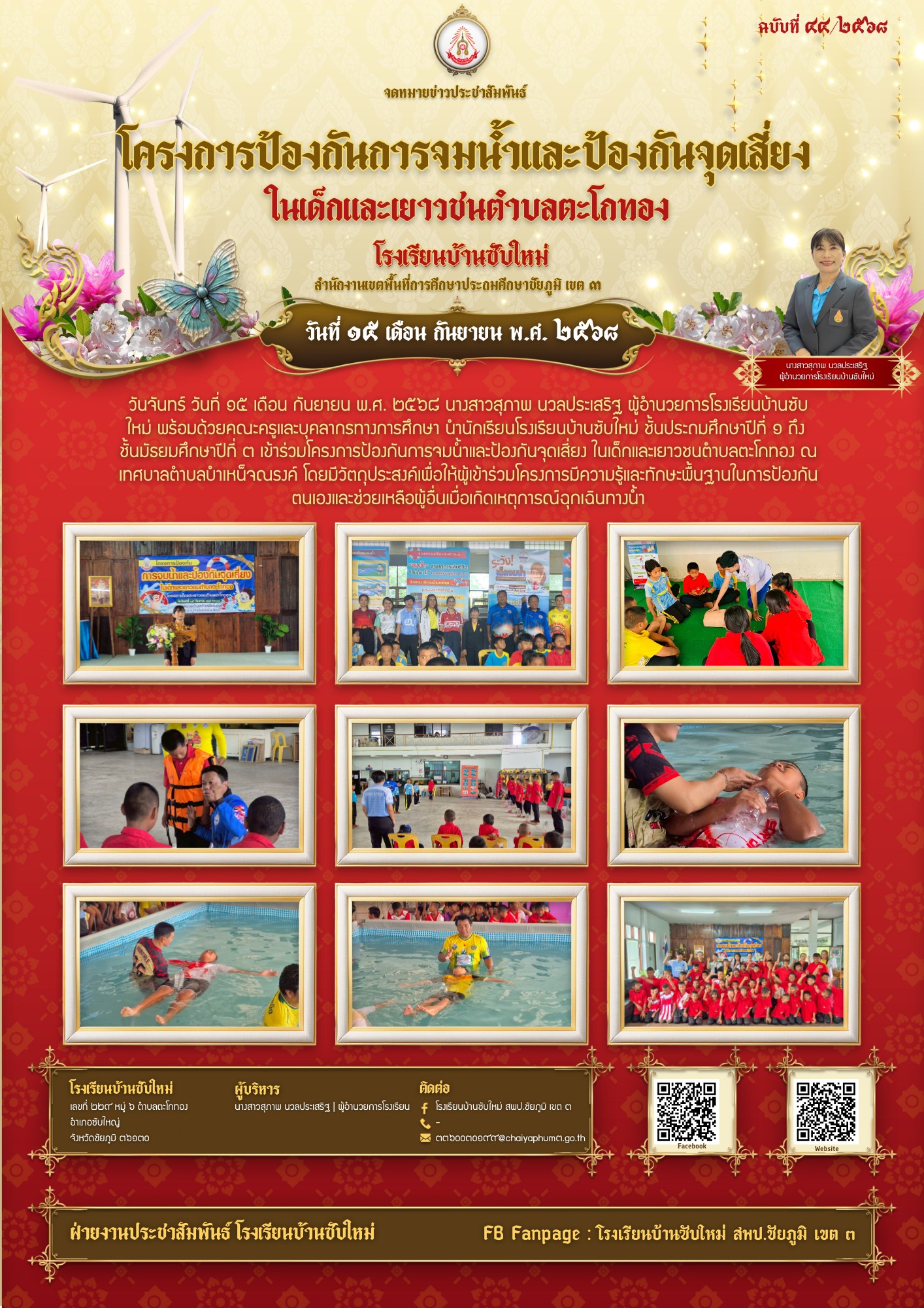 2 | วันจันทร์ วันที่ ๑๕ เดือน กันยายน พ.ศ. ๒๕๖๘ นางสาวสุภาพ นวลประเสริฐ ผู้อำนวยการโรงเรียนบ้านซับใหม่ พร้อมด้วยคณะครูและบุคลากรทางการศึกษา นำนักเรียนโรงเรียนบ้านซับใหม่ ชั้นประถมศึกษาปีที่ ๑ ถึง ชั้นมัธยมศึกษาปีที่ ๓ เข้าร่วมโครงการป้องกันการจมน้ำและป้องกันจุดเสี่ยง ในเด็กและเยาวชนตำบลตะโกทอง ณ เทศบาลตำบลบำเหน็จณรงค์ โดยมีวัตถุประสงค์เพื่อให้ผู้เข้าร่วมโครงการมีความรู้และทักษะพื้นฐานในการป้องกันตนเองและช่วยเหลือผู้อื่นเมื่อเกิดเหตุการณ์ฉุกเฉินทางน้ำ
