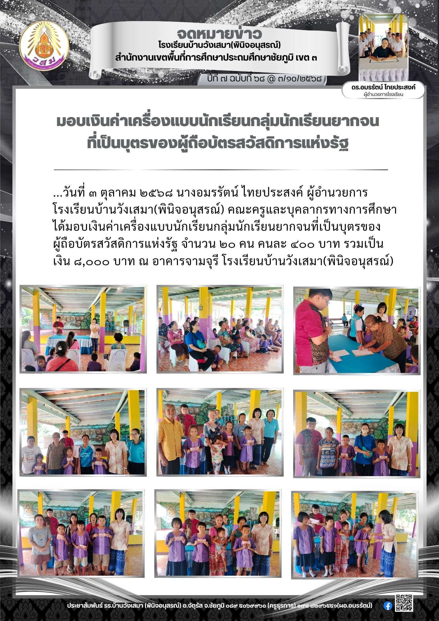 | 1 | ...วันที่ ๓ ตุลาคม ๒๕๖๘ นางอมรรัตน์ ไทยประสงค์ ผู้อำนวยการโรงเรียนบ้านวังเสมา(พินิจอนุสรณ์) คณะครูและบุคลากรทางการศึกษา ได้มอบเงินค่าเครื่องแบบนักเรียนกลุ่มนักเรียนยากจนที่เป็นบุตรของผู้ถือบัตรสวัสดิการแห่งรัฐ จำนวน ๒๐ คน คนละ ๔๐๐ บาท รวมเป็นเงิน ๘,๐๐๐ บาท ณ อาคารจามจุรี โรงเรียนบ้านวังเสมา(พินิจอนุสรณ์)