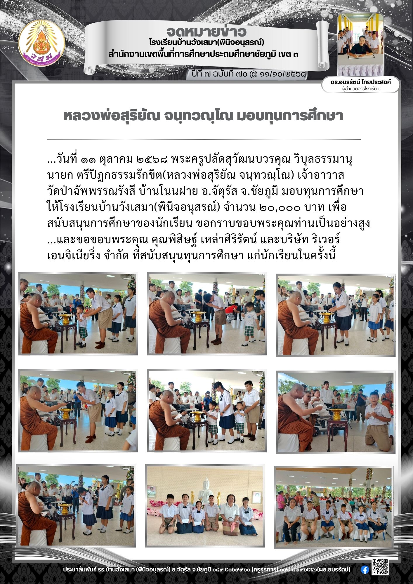 | 2 | ...วันที่ ๑๑ ตุลาคม ๒๕๖๘ พระครูปลัดสุวัฒนบวรคุณ วิบุลธรรมานุนายก ตรีปิฎกธรรมรักขิต(หลวงพ่อสุริยัณ จนฺทวณฺโณ) เจ้าอาวาสวัดป่าฉัพพรรณรังสี บ้านโนนฝาย อ.จัตุรัส จ.ชัยภูมิ มอบทุนการศึกษาให้โรงเรียนบ้านวังเสมา (พินิจอนุสรณ์) จำนวน ๒๐,๐๐๐ บาท เพื่อสนับสนุนการศึกษาของนักเรียน ขอกราบขอบพระคุณท่านเป็นอย่างสูง ...และขอขอบพระคุณ คุณพิสิษฐ์ เหล่าศิริรัตน์ และบริษัท ริเวอร์ เอนจิเนียริ่ง จำกัด ที่สนับสนุนทุนการศึกษาแก่นักเรียนในครั้งนี้