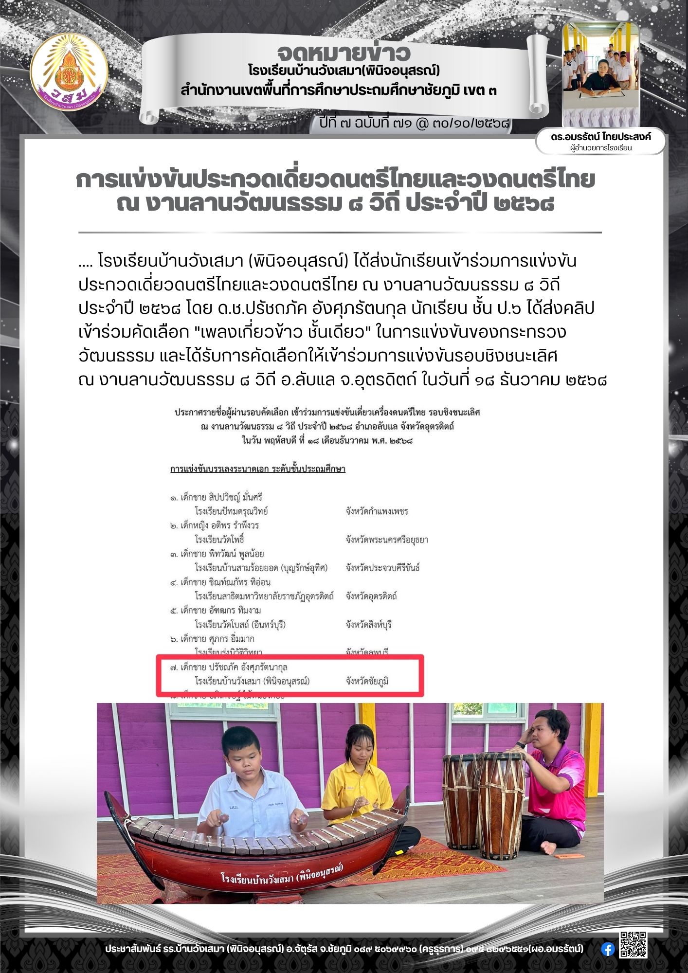 | 3 | .... วันที่ ๒๐ ตุลาคม ๒๕๖๘ โรงเรียนบ้านวังเสมา (พินิจอนุสรณ์) ได้ส่งนักเรียนเข้าร่วมการแข่งขันประกวดเดี่ยวดนตรีไทยและวงดนตรีไทย ณ งานลานวัฒนธรรม ๘ วิถี ประจำปี ๒๕๖๘ โดย ด.ช.ปรัชถภัค อังศุภรัตนกุล นักเรียน ชั้น ป.๖ ได้ส่งคลิปเข้าร่วมคัดเลือก "เพลงเกี่ยวข้าว ชั้นเดียว" ในการแข่งขันของกระทรวงวัฒนธรรม และได้รับการคัดเลือกให้เข้าร่วมการแข่งขันรอบชิงชนะเลิศ ณ งานลานวัฒนธรรม ๘ วิถี อ.ลับแล จ.อุตรดิตถ์ ในวันที่ ๑๘ ธันวาคม ๒๕๖๘