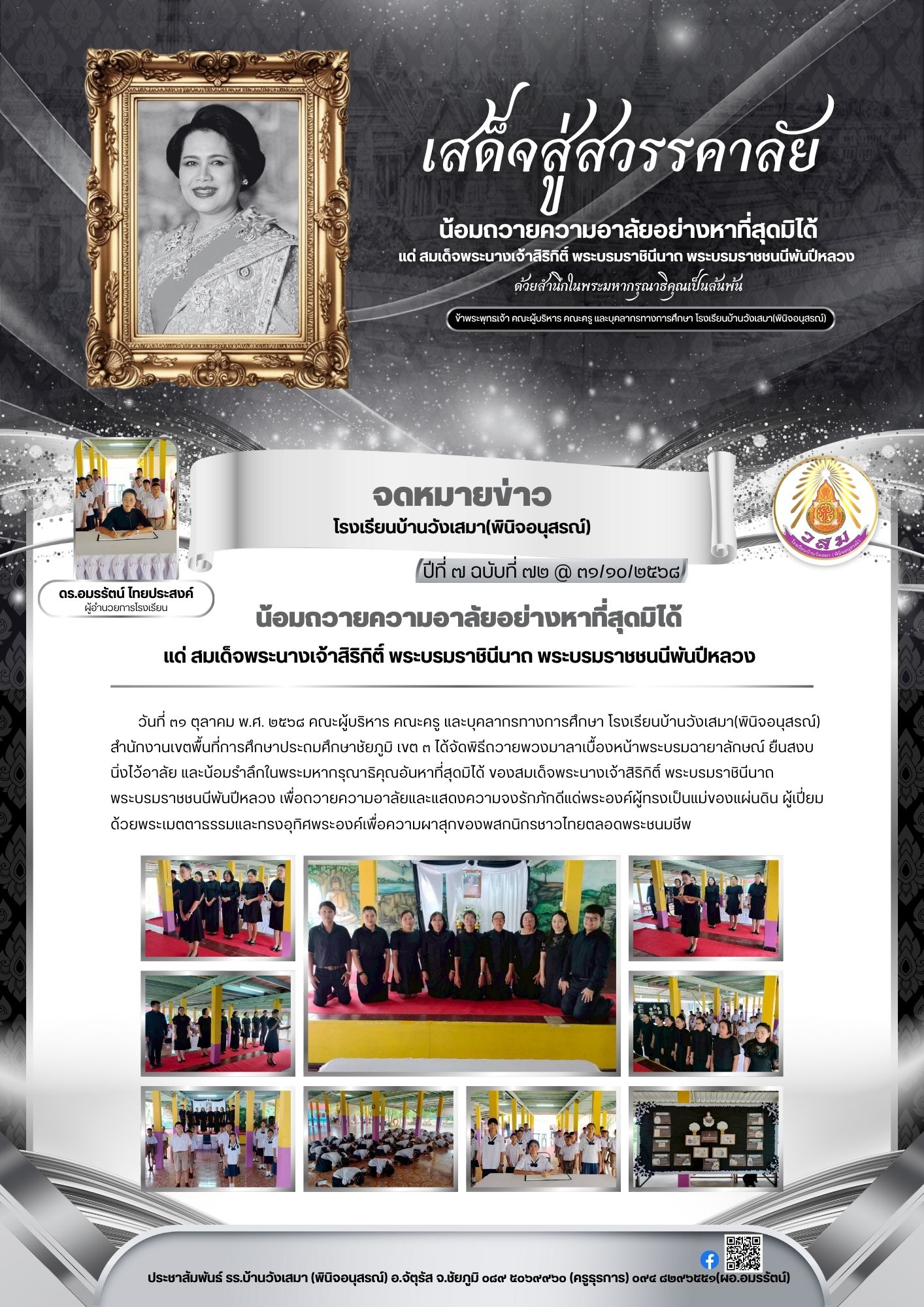 | 4 | ...วันที่ ๓๑ ตุลาคม พ.ศ. ๒๕๖๘ คณะผู้บริหาร คณะครู และบุคลากรทางการศึกษา โรงเรียนบ้านวังเสมา(พินิจอนุสรณ์) สำนักงานเขตพื้นที่การศึกษาประถมศึกษาชัยภูมิ เขต ๓ ได้จัดพิธีถวายพวงมาลาเบื้องหน้าพระบรมฉายาลักษณ์ ยืนสงบนิ่งไว้อาลัย และน้อมรำลึกในพระมหากรุณาธิคุณอันหาที่สุดมิได้ ของสมเด็จพระนางเจ้าสิริกิติ์ พระบรมราชินีนาถ พระบรมราชชนนีพันปีหลวง เพื่อถวายความอาลัยและแสดงความจงรักภักดีแด่พระองค์ผู้ทรงเป็นแม่ของแผ่นดิน ผู้เปี่ยมด้วยพระเมตตาธรรมและทรงอุทิศพระองค์เพื่อความผาสุกของพสกนิกรชาวไทยตลอดพระชนมชีพ