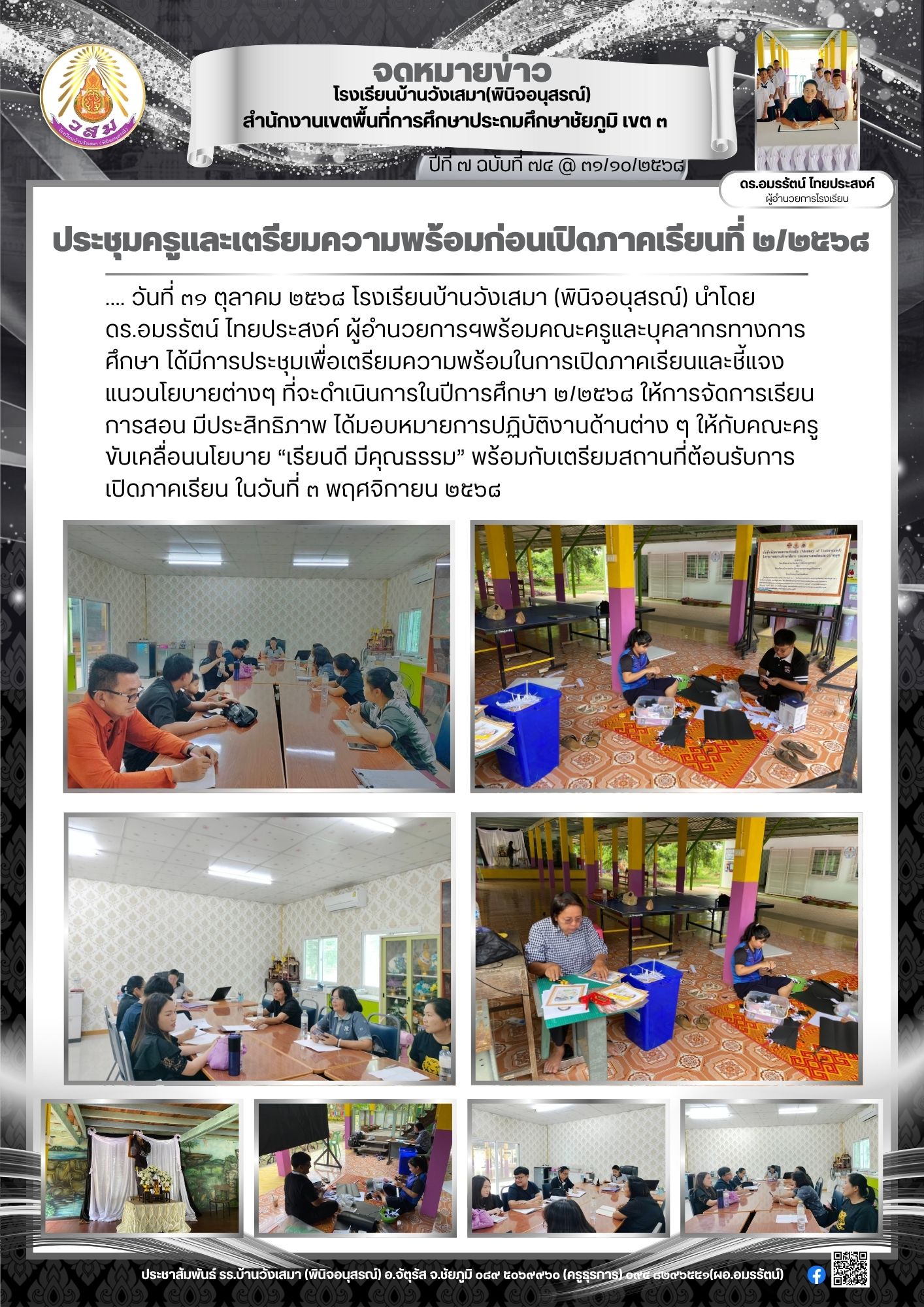 | 5 | .... วันที่ ๓๑ ตุลาคม ๒๕๖๘ โรงเรียนบ้านวังเสมา (พินิจอนุสรณ์) นำโดย ดร.อมรรัตน์ ไทยประสงค์ ผู้อำนวยการฯพร้อมคณะครูและบุคลากรทางการศึกษา ได้มีการประชุมเพื่อเตรียมความพร้อมในการเปิด ภาคเรียนและชี้แจงแนวนโยบายต่างๆ ที่จะดำเนินการในปีการศึกษา ๒/๒๕๖๘ ให้การจัดการเรียนการสอน มีประสิทธิภาพ ได้มอบหมายการปฏิบัติงานด้านต่าง ๆ ให้กับคณะครู ขับเคลื่อนนโยบาย “เรียนดี มีคุณธรรม” พร้อมกับเตรียมสถานที่ต้อนรับการเปิดภาคเรียน ในวันที่ ๓ พฤศจิกายน ๒๕๖๘