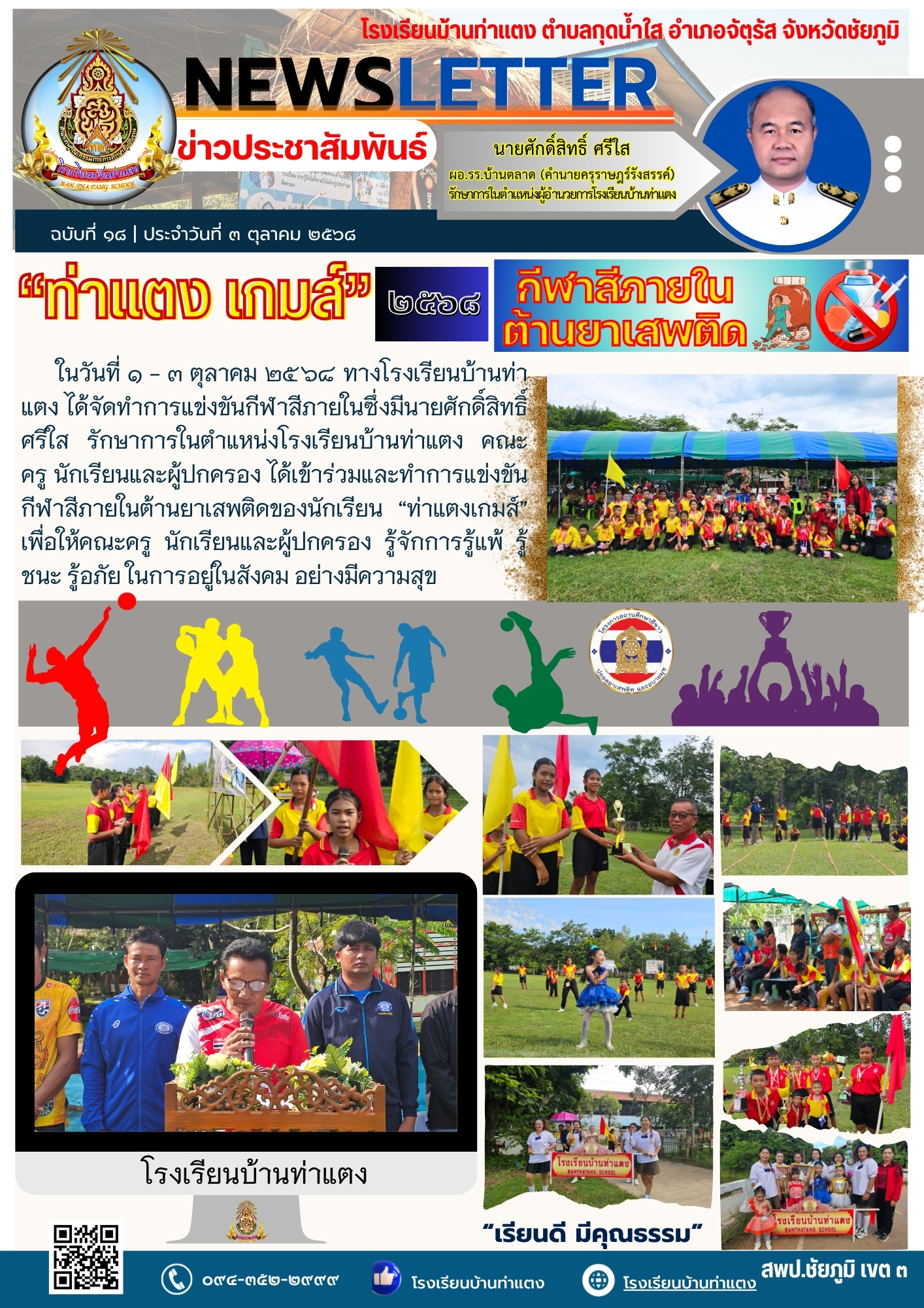 - ในวันที่ ๑ - ๓ ตุลาคม ๒๕๖๘ ทางโรงเรียนบ้านท่าแตง ได้จัดทำการแข่งขันกีฬาสีภายในซึ่งมีนายศักดิ์สิทธิ์ ศรีใส รักษาการในตำแหน่งโรงเรียนบ้านท่าแตง คณะครู นักเรียนและผู้ปกครอง ได้เข้าร่วมและทำการแข่งขัน กีฬาสีภายในต้านยาเสพติดของนักเรียน “ท่าแตงเกมส์” เพื่อให้คณะครู นักเรียนและผู้ปกครอง รู้จักการรู้แพ้ รู้ชนะ รู้อภัย ในการอยู่ในสังคม อย่างมีความสุข