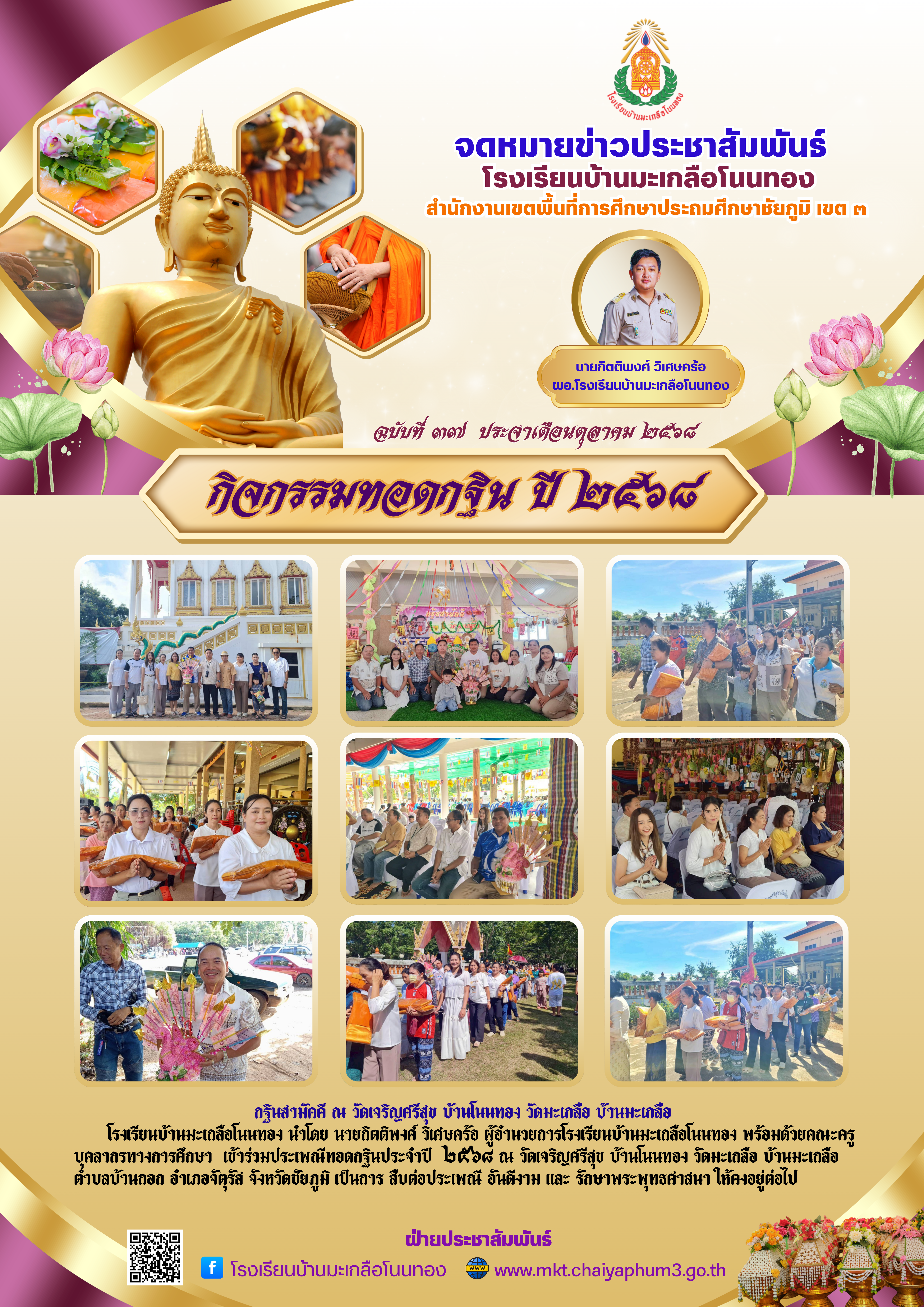 | 2 | โรงเรียนบ้านมะเกลือโนนทอง นำโดย นายกิตติพงศ์ วิเศษคร้อ ผู้อำนวยการโรงเรียนบ้านมะเกลือโนนทอง พร้อมด้วยคณะครูบุคลากรทางการศึกษา เข้าร่วมประเพณีทอดกฐินประจำปี ๒๕๖๘ ณ วัดเจริญศรีสุข บ้านโนนทอง วัดมะเกลือ บ้านมะเกลือ ตำบลบ้านกอก อำเภอจัตุรัส จังหวัดชัยภูมิ เป็นการ สืบต่อประเพณี อันดีงาม และ รักษาพระพุทธศาสนา ให้คงอยู่ต่อไป