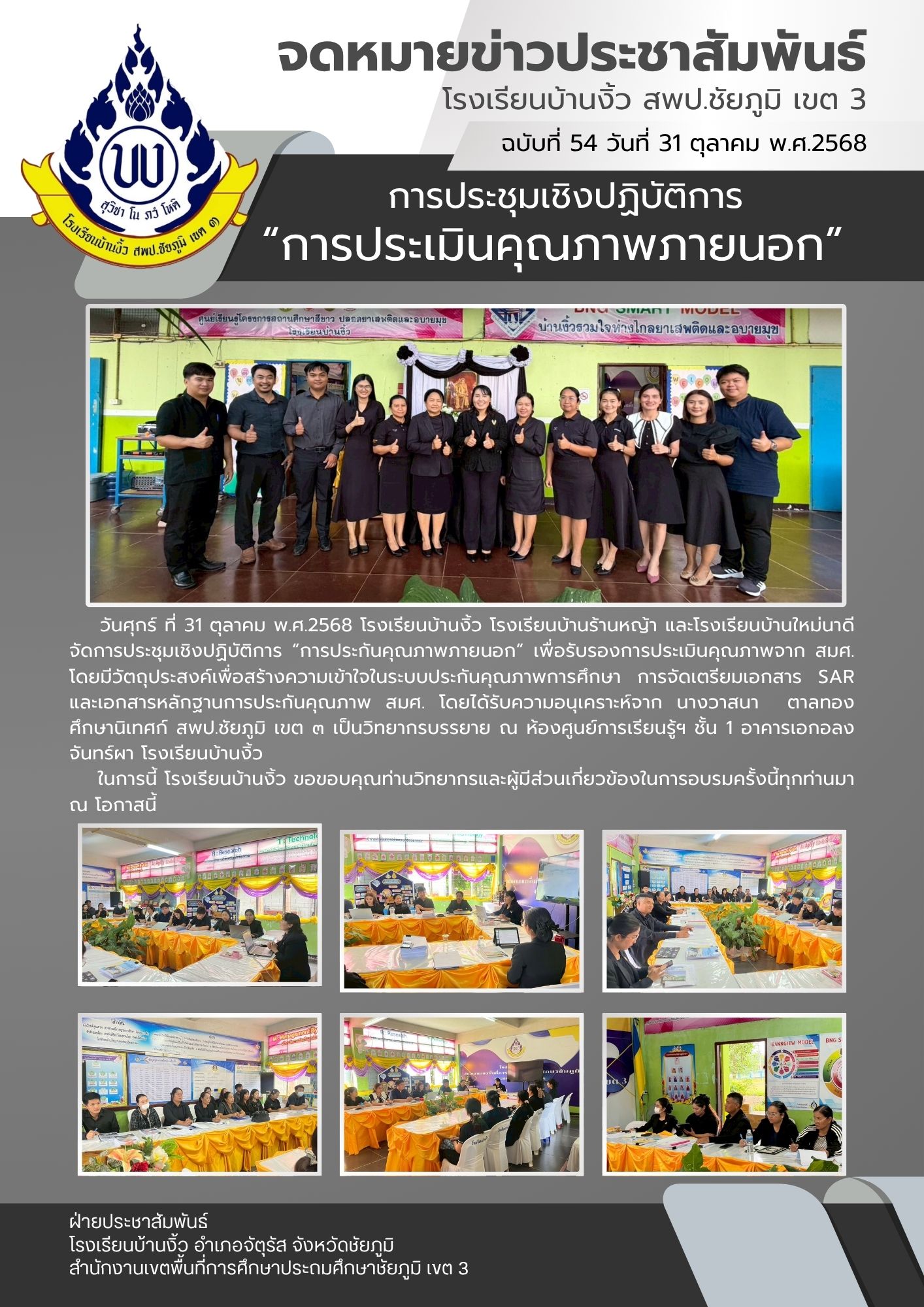 วันศุกร์ ที่ 31 ตุลาคม พ.ศ.2568 โรงเรียนบ้านงิ้ว โรงเรียนบ้านร้านหญ้า และโรงเรียนบ้านใหม่นาดี จัดการประชุมเชิงปฏิบัติการ “การประกันคุณภาพภายนอก” เพื่อรับรองการประเมินคุณภาพจาก สมศ. โดยมีวัตถุประสงค์เพื่อสร้างความเข้าใจในระบบประกันคุณภาพการศึกษา การจัดเตรียมเอกสาร SAR และเอกสารหลักฐานการประกันคุณภาพ สมศ. โดยได้รับความอนุเคราะห์จาก นางวาสนา ตาลทอง ศึกษานิเทศก์ สพป.ชัยภูมิ เขต ๓ เป็นวิทยากรบรรยาย ณ ห้องศูนย์การเรียนรู้ฯ ชั้น 1 อาคารเอกอลงจันทร์ผา โรงเรียนบ้านงิ้ว