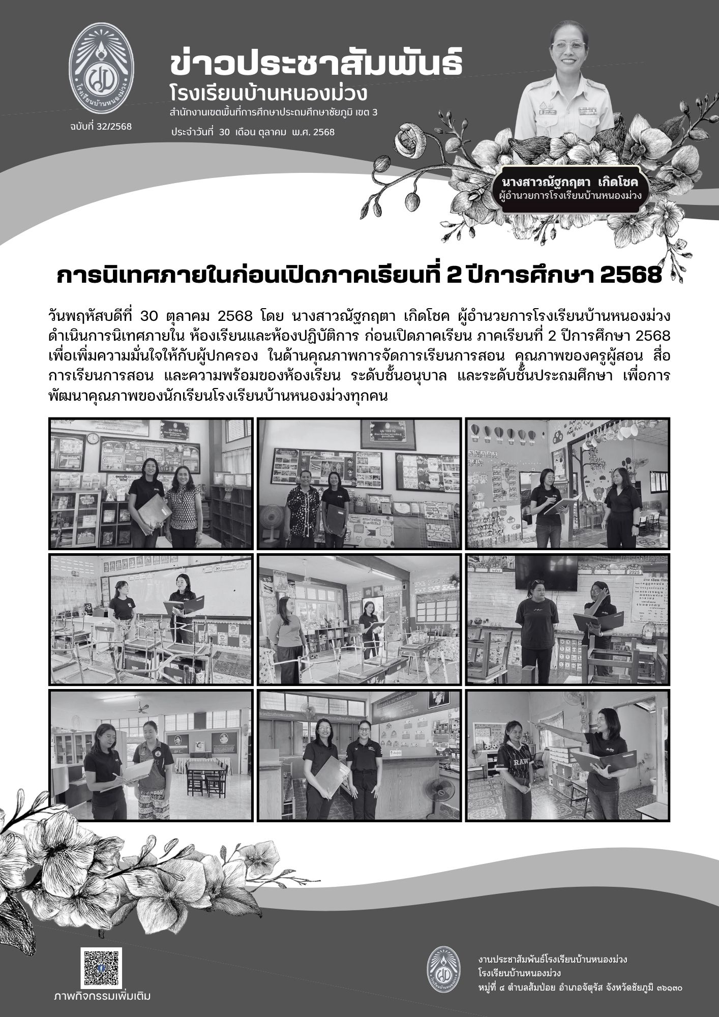 วันพฤหัสบดีที่ 30 ตุลาคม 2568 โดย นางสาวณัฐกฤตา เกิดโชค ผู้อำนวยการโรงเรียนบ้านหนองม่วงดำเนินการนิเทศภายใน ห้องเรียนและห้องปฏิบัติการ ก่อนเปิดภาคเรียน ภาคเรียนที่ 2 ปีการศึกษา 2568 เพื่อเพิ่มความมั่นใจให้กับผู้ปกครอง ในด้านคุณภาพการจัดการเรียนการสอน คุณภาพของครูผู้สอน สื่อการเรียนการสอน และความพร้อมของห้องเรียน ระดับชั้นอนุบาล และระดับชั้นประถมศึกษา เพื่อการพัฒนาคุณภาพของนักเรียนโรงเรียนบ้านหนองม่วงทุกคน