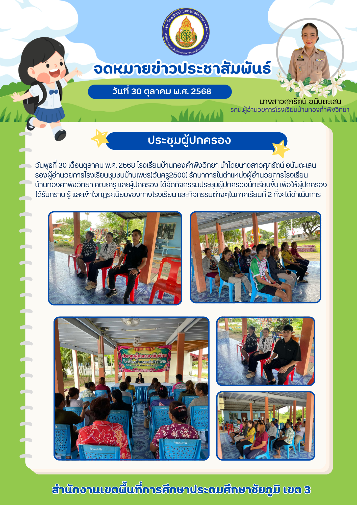 | 1 | วันพุธที่ 30 เดือนตุลาคม พ.ศ. 2568 โรงเรียนบ้านทองคำพิงวิทยา นำโดยนางสาวศุภรัตน์ อนันตะเสน รองผู้อำนวยการโรงเรียนชุมชนบ้านเพชร(วันครู2500) รักษาการในตำแหน่งผู้อำนวยการโรงเรียนบ้านทองคำพิงวิทยา คณะครู และผู้ปกครอง ได้จัดกิจกรรมประชุมผู้ปกครองนักเรียนขึ้น เพื่อให้ผู้ปกครองได้รับทราบ รู้ และเข้าใจกฎระเบียบของทางโรงเรียน และกิจกรรมต่างๆในภาคเรียนที่ 2 ที่จะได้ดำเนินการ