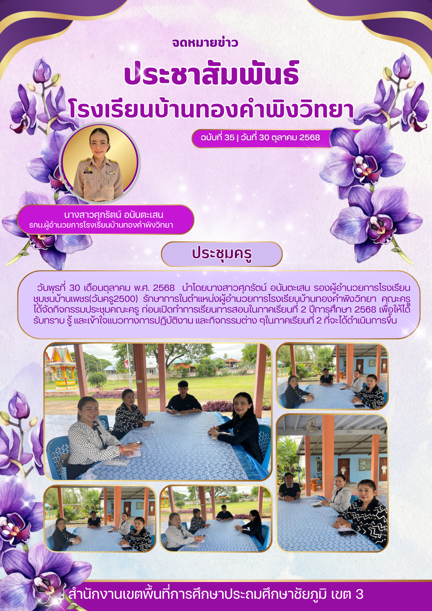 | 2 | วันพุธที่ 30 เดือนตุลาคม พ.ศ. 2568 นำโดยนางสาวศุภรัตน์ อนันตะเสน รองผู้อำนวยการโรงเรียนชุมชนบ้านเพชร(วันครู2500) รักษาการในตำแหน่งผู้อำนวยการโรงเรียนบ้านทองคำพิงวิทยา คณะครู ได้จัดกิจกรรมประชุมคณะครู ก่อนเปิดทำการเรียนการสอนในภาคเรียนที่ 2 ปีการศึกษา 2568 เพื่อให้ได้รับทราบ รู้ และเข้าใจแนวทางการปฏิบัติงาน และกิจกรรมต่าง ๆในภาคเรียนที่ 2 ที่จะได้ดำเนินการขึ้น