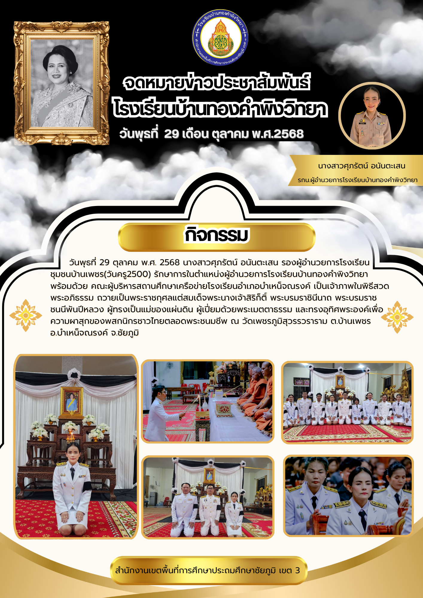 | 3 | วันพุธที่ 29 ตุลาคม พ.ศ. 2568 นางสาวศุภรัตน์ อนันตะเสน รองผู้อำนวยการโรงเรียนชุมชนบ้านเพชร(วันครู2500) รักษาการในตำแหน่งผู้อำนวยการโรงเรียนบ้านทองคำพิงวิทยา พร้อมด้วย คณะผู้บริหารสถานศึกษาเครือข่ายโรงเรียนอำเภอบำเหน็จณรงค์ เป็นเจ้าภาพในพิธีสวดพระอภิธรรม ถวายเป็นพระราชกุศลแต่สมเด็จพระนางเจ้าสิริก็ติ์ พระบรมราชินีนาถ พระบรมราชชนนีพันปีหลวง ผู้ทรงเป็นแม่ของแผ่นดิน ผู้เปี่ยมด้วยพระเมตตาธรรม และทรงอุทิศพระองค์เพื่อความผาสุกของพสกนิกรชาวไทยตลอดพระชนมชีพ ณ วัดเพชรภูมิสุวรรวราราม ต.บ้านเพชร อ.บำเหน็จณรงค์ จ.ชัยภูมิ