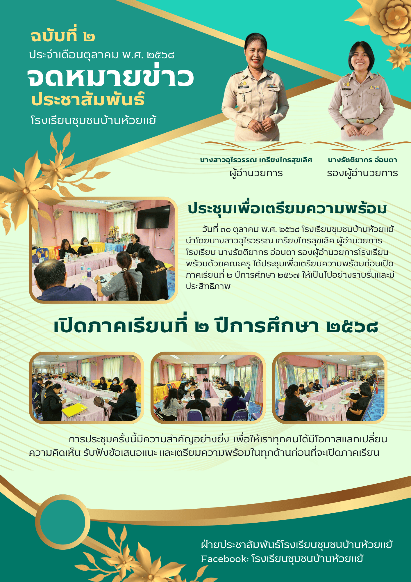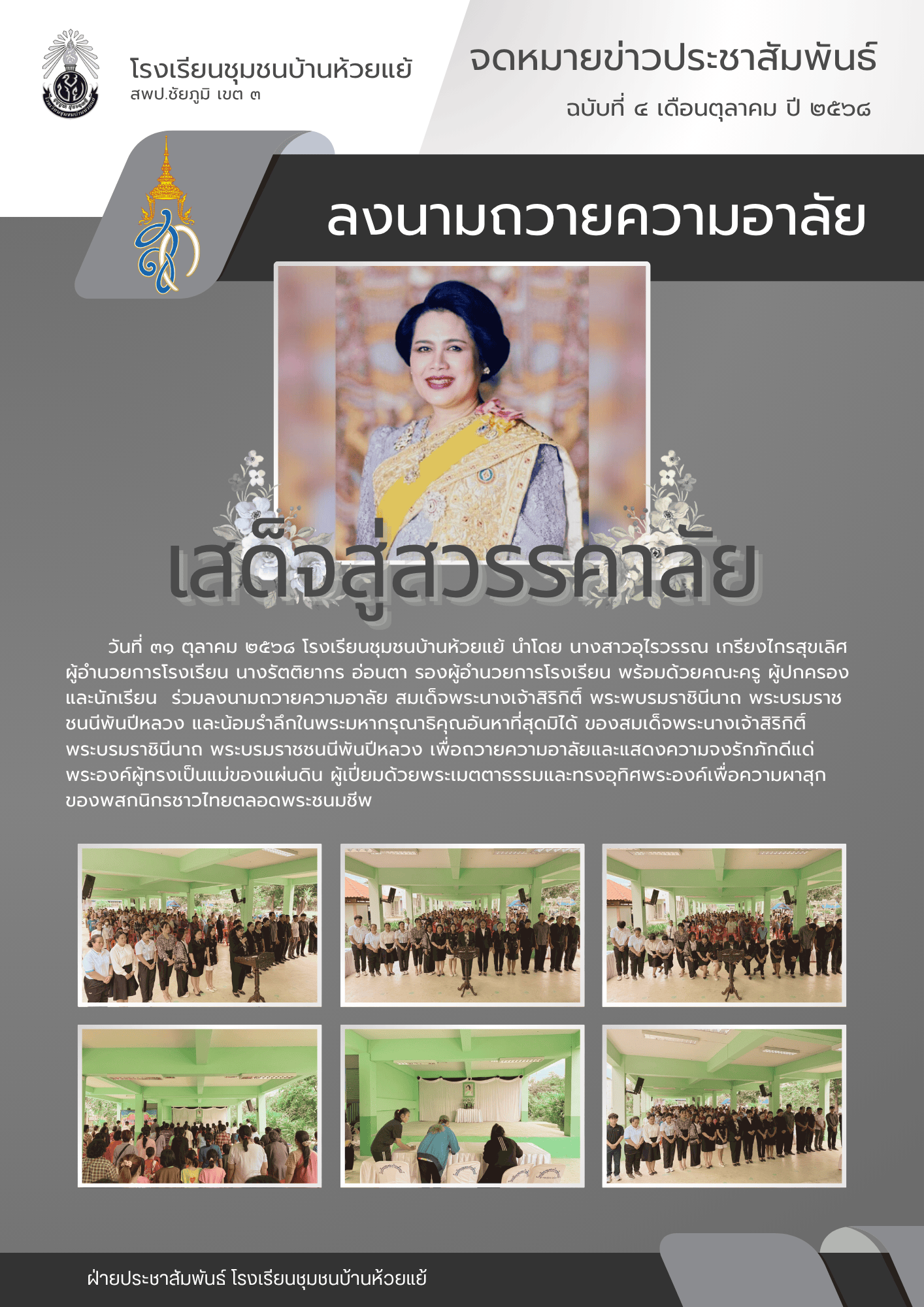 | 3 | วันที่ ๓๑ ตุลาคม ๒๕๖๘ โรงเรียนชุมชนบ้านห้วยแย้ นำโดย นางสาวอุไรวรรณ เกรียงไกรสุขเลิศ