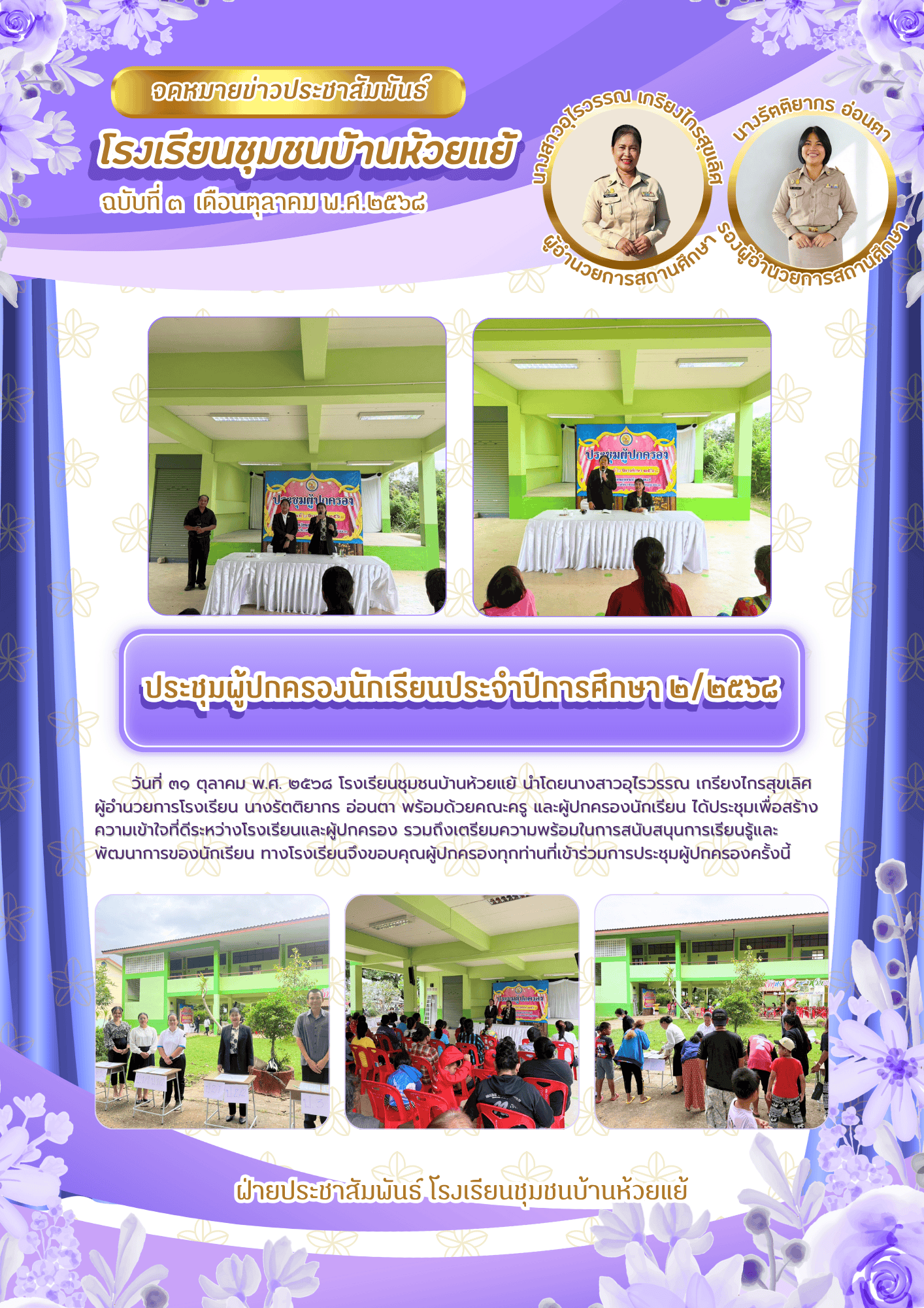 | 2 | วันที่ ๓๑ ตุลาคม พ.ศ. ๒๕๖๘ โรงเรียนชุมชนบ้านห้วยแย้ นำโดยนางสาวอุไรวรรณ เกรียงไกรสุขเลิศ ผู้อำนวยการโรงเรียน นางรัตติยากร อ่อนตา พร้อมด้วยคณะครู และผู้ปกครองนักเรียน ได้ประชุมเพื่อสร้างความเข้าใจที่ดีระหว่างโรงเรียนและผู้ปกครอง รวมถึงเตรียมความพร้อมในการสนับสนุนการเรียนรู้และพัฒนาการของนักเรียน ทางโรงเรียนจึงขอบคุณผู้ปกครองทุกท่านที่เข้าร่วมการประชุมผู้ปกครองครั้งนี้