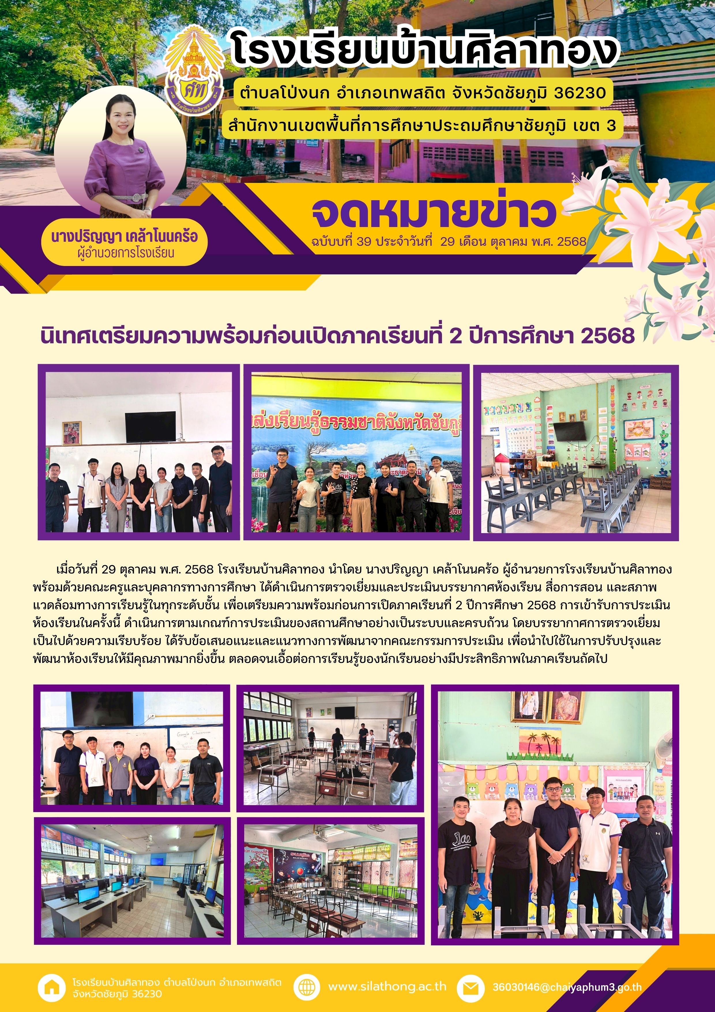| 2 | เมื่อวันที่ 29 ตุลาคม พ.ศ. 2568 โรงเรียนบ้านศิลาทอง นำโดย นางปริญญา เคล้าโนนคร้อ ผู้อำนวยการโรงเรียนบ้านศิลาทองพร้อมด้วยคณะครูและบุคลากรทางการศึกษา ได้ดำเนินการตรวจเยี่ยมและประเมินบรรยากาศห้องเรียน สื่อการสอน และสภาพแวดล้อมทางการเรียนรู้ในทุกระดับชั้น เพื่อเตรียมความพร้อมก่อนการเปิดภาคเรียนที่ 2 ปีการศึกษา 2568 การเข้ารับการประเมินห้องเรียนในครั้งนี้ ดำเนินการตามเกณฑ์การประเมินของสถานศึกษาอย่างเป็นระบบและครบถ้วน โดยบรรยากาศการตรวจเยี่ยมเป็นไปด้วยความเรียบร้อย ได้รับข้อเสนอแนะและแนวทางการพัฒนาจากคณะกรรมการประเมิน เพื่อนำไปใช้ในการปรับปรุงและพัฒนาห้องเรียนให้มีคุณภาพมากยิ่งขึ้น ตลอดจนเอื้อต่อการเรียนรู้ของนักเรียนอย่างมีประสิทธิภาพในภาคเรียนถัดไป