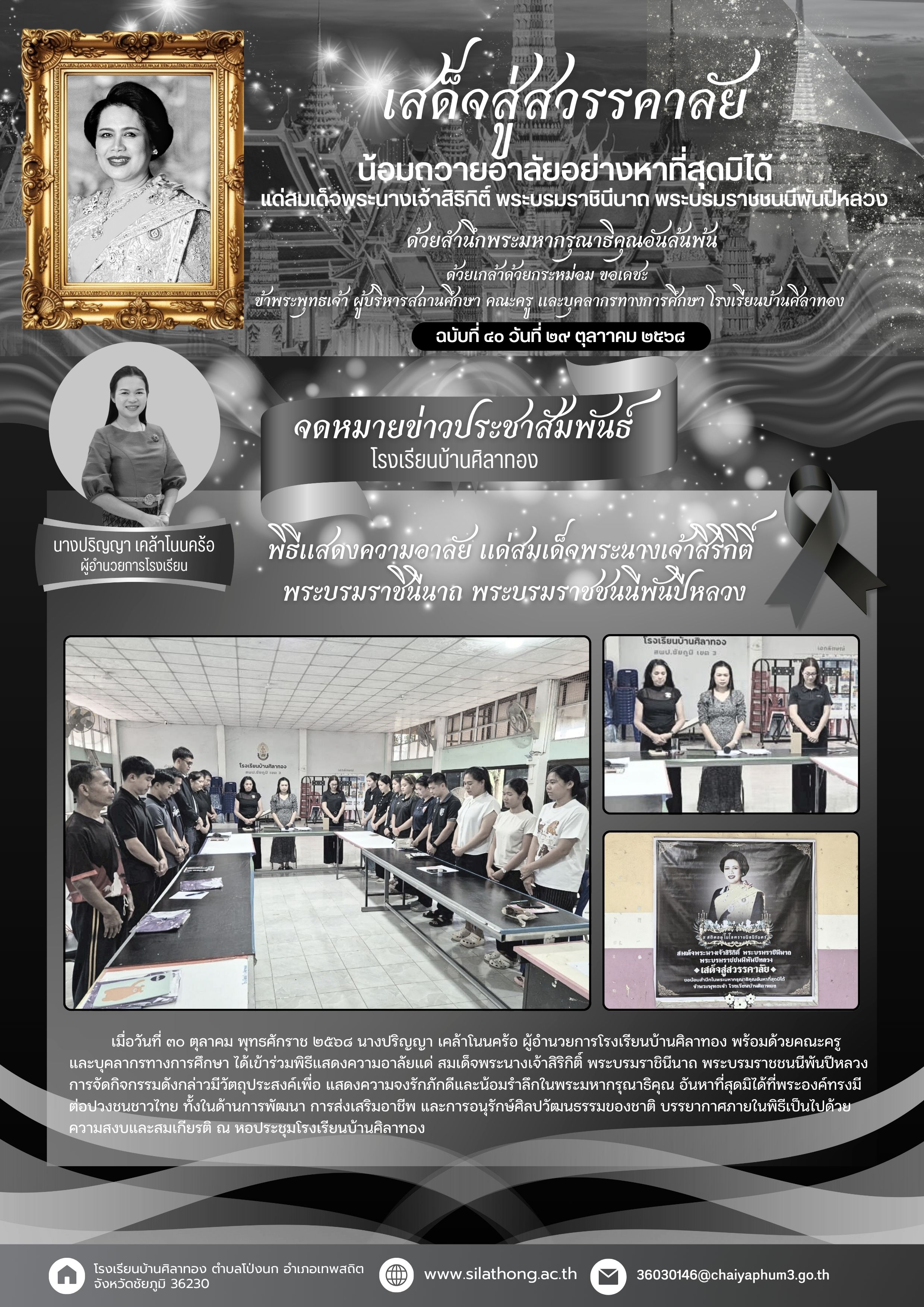 | 3 | เมื่อวันที่ ๓๐ ตุลาคม พุทธศักราช ๒๕๖๘ นางปริญญา เคล้าโนนคร้อ ผู้อำนวยการโรงเรียนบ้านศิลาทอง พร้อมด้วยคณะครู และบุคลากรทางการศึกษา ได้เข้าร่วมพิธีแสดงความอาลัยแด่ สมเด็จพระนางเจ้าสิริกิติ์ พระบรมราชินีนาถ พระบรมราชชนนีพันปีหลวง การจัดกิจกรรมดังกล่าวมีวัตถุประสงค์เพื่อ แสดงความจงรักภักดีและน้อมรำลึกในพระมหากรุณาธิคุณ อันหาที่สุดมิได้ที่พระองค์ทรงมีต่อปวงชนชาวไทย ทั้งในด้านการพัฒนา การส่งเสริมอาชีพ และการอนุรักษ์ศิลปวัฒนธรรมของชาติ บรรยากาศภายในพิธีเป็นไปด้วยความสงบและสมเกียรติ ณ หอประชุมโรงเรียนบ้านศิลาทอง