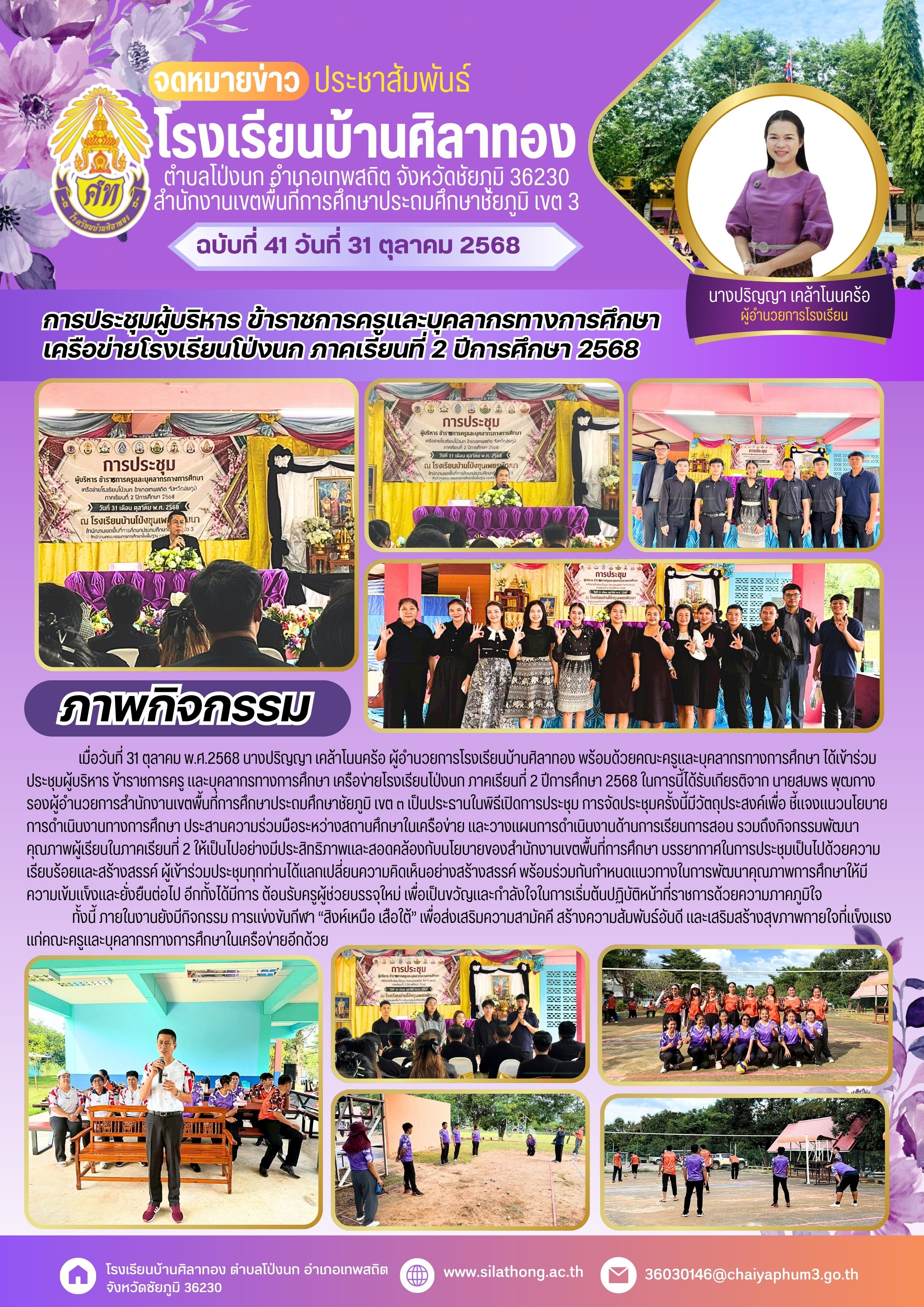 เมื่อวันที่ 31 ตุลาคม พ.ศ.2568 นางปริญญา เคล้าโนนคร้อ ผู้อำนวยการโรงเรียนบ้านศิลาทอง พร้อมด้วยคณะครูและบุคลากรทางการศึกษา ได้เข้าร่วมประชุมผู้บริหาร ข้าราชการครู และบุคลากรทางการศึกษา เครือข่ายโรงเรียนโป่งนก ภาคเรียนที่ 2 ปีการศึกษา 2568 ในการนี้ได้รับเกียรติจาก นายสมพร พุฒกาง รองผู้อำนวยการสำนักงานเขตพื้นที่การศึกษาประถมศึกษาชัยภูมิ เขต ๓ เป็นประธานในพิธีเปิดการประชุม การจัดประชุมครั้งนี้มีวัตถุประสงค์เพื่อ ชี้แจงแนวนโยบายการดำเนินงานทางการศึกษา ประสานความร่วมมือระหว่างสถานศึกษาในเครือข่าย และวางแผนการดำเนินงานด้านการเรียนการสอน รวมถึงกิจกรรมพัฒนาคุณภาพผู้เรียนในภาคเรียนที่ 2 ให้เป็นไปอย่างมีประสิทธิภาพและสอดคล้องกับนโยบายของสำนักงานเขตพื้นที่การศึกษา บรรยากาศในการประชุมเป็นไปด้วยความเรียบร้อยและสร้างสรรค์ ผู้เข้าร่วมประชุมทุกท่านได้แลกเปลี่ยนความคิดเห็นอย่างสร้างสรรค์ พร้อมร่วมกันกำหนดแนวทางในการพัฒนาคุณภาพการศึกษาให้มีความเข้มแข็งและยั่งยืนต่อไป อีกทั้งได้มีการ ต้อนรับครูผู้ช่วยบรรจุใหม่ เพื่อเป็นขวัญและกำลังใจในการเริ่มต้นปฏิบัติหน้าที่ราชการด้วยความภาคภูมิใจ