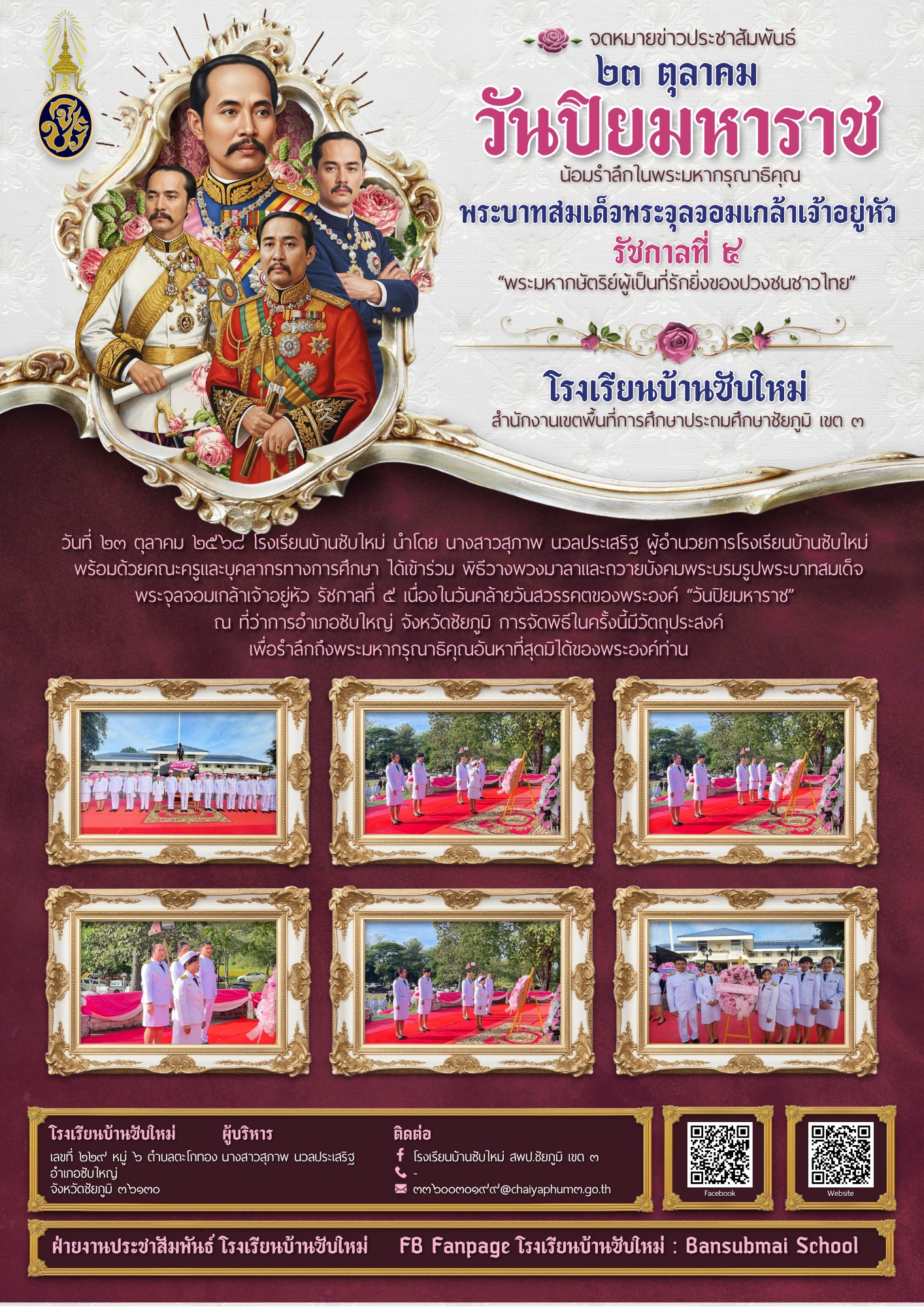 | 1 | วันที่ ๒๓ ตุลาคม ๒๕๖๘ โรงเรียนบ้านซับใหม่ นำโดย นางสาวสุภาพ นวลประเสริฐ ผู้อำนวยการโรงเรียนบ้านซับใหม่ พร้อมด้วยคณะครูและบุคลากรทางการศึกษา ได้เข้าร่วม พิธีวางพวงมาลาและถวายบังคมพระบรมรูปพระบาทสมเด็จพระจุลจอมเกล้าเจ้าอยู่หัว รัชกาลที่ ๕ เนื่องในวันคล้ายวันสวรรคตของพระองค์ “วันปิยมหาราช” ณ ที่ว่าการอำเภอซับใหญ่ จังหวัดชัยภูมิ การจัดพิธีในครั้งนี้มีวัตถุประสงค์เพื่อรำลึกถึงพระมหากรุณาธิคุณอันหาที่สุดมิได้ของพระองค์ท่าน