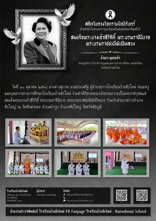 | 2 | วันที่ ๓๐ ตุลาคม ๒๕๖๘ นางสาวสุภาพ นวลประเสริฐ ผู้อำนวยการโรงเรียนบ้านซับใหม่ คณะครูและบุคลากรทางการศึกษาโรงเรียนบ้านซับใหม่ ร่วมทำพิธีสวดพระอภิธรรมถวายเป๋็นพระราชกุศลแด่สมเด็จพระนางเจ้าสิริกิติ์ พระบรมราชินีนาถ พระบรมราชชนนีพันปีหลวง ร่วมกับส่วนราชการอำเภอซับใหญ่ ณ วัดซับสายออ ตำบลท่ากูบ อำเภอซับใหญ่ จังหวัดชัยภูมิ