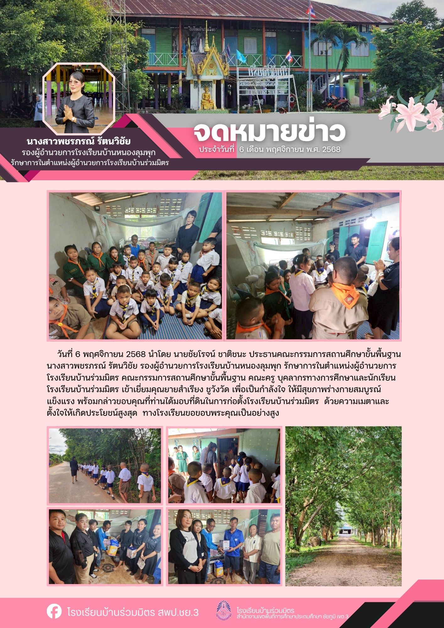| 7 | เข้าเยี่ยมคุณยายสำเรียง ชูวังวัด เพื่อเป็นกำลังใจ ให้มีสุขภาพร่างกายสมบูรณ์ แข็งแรง พร้อมกล่าวขอบคุณที่ท่านได้มอบที่ดินในการก่อตั้งโรงเรียนบ้านร่วมมิตร