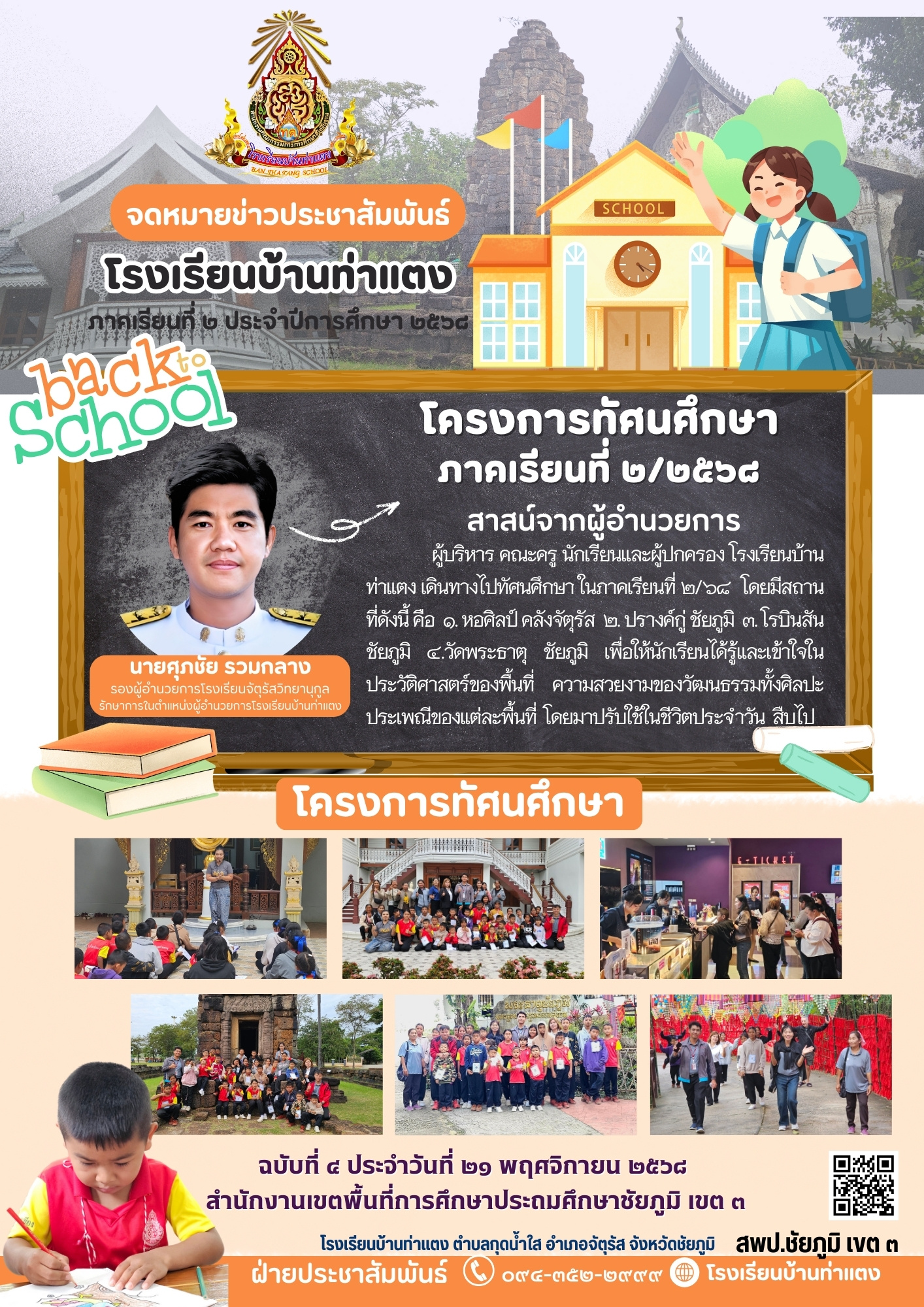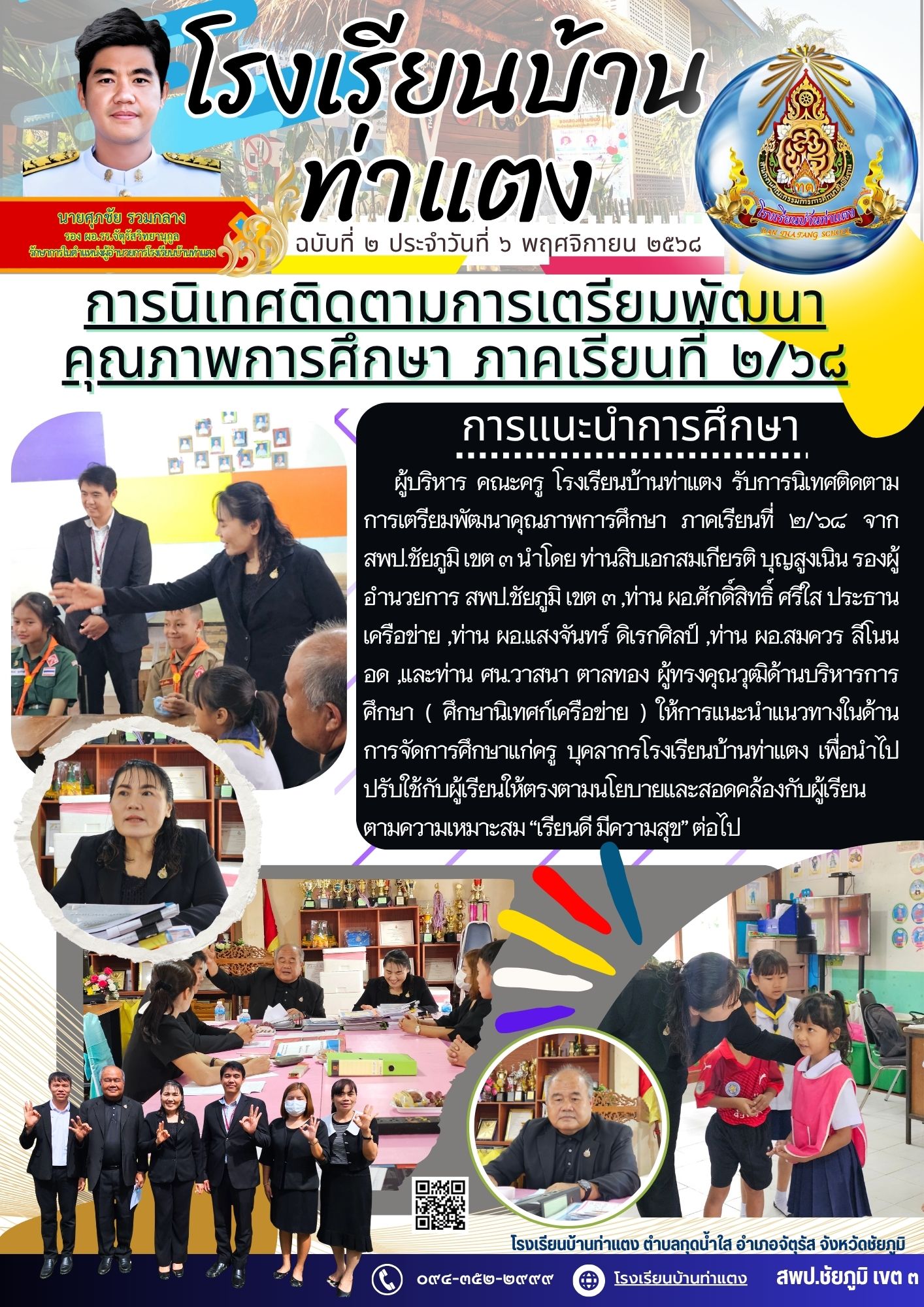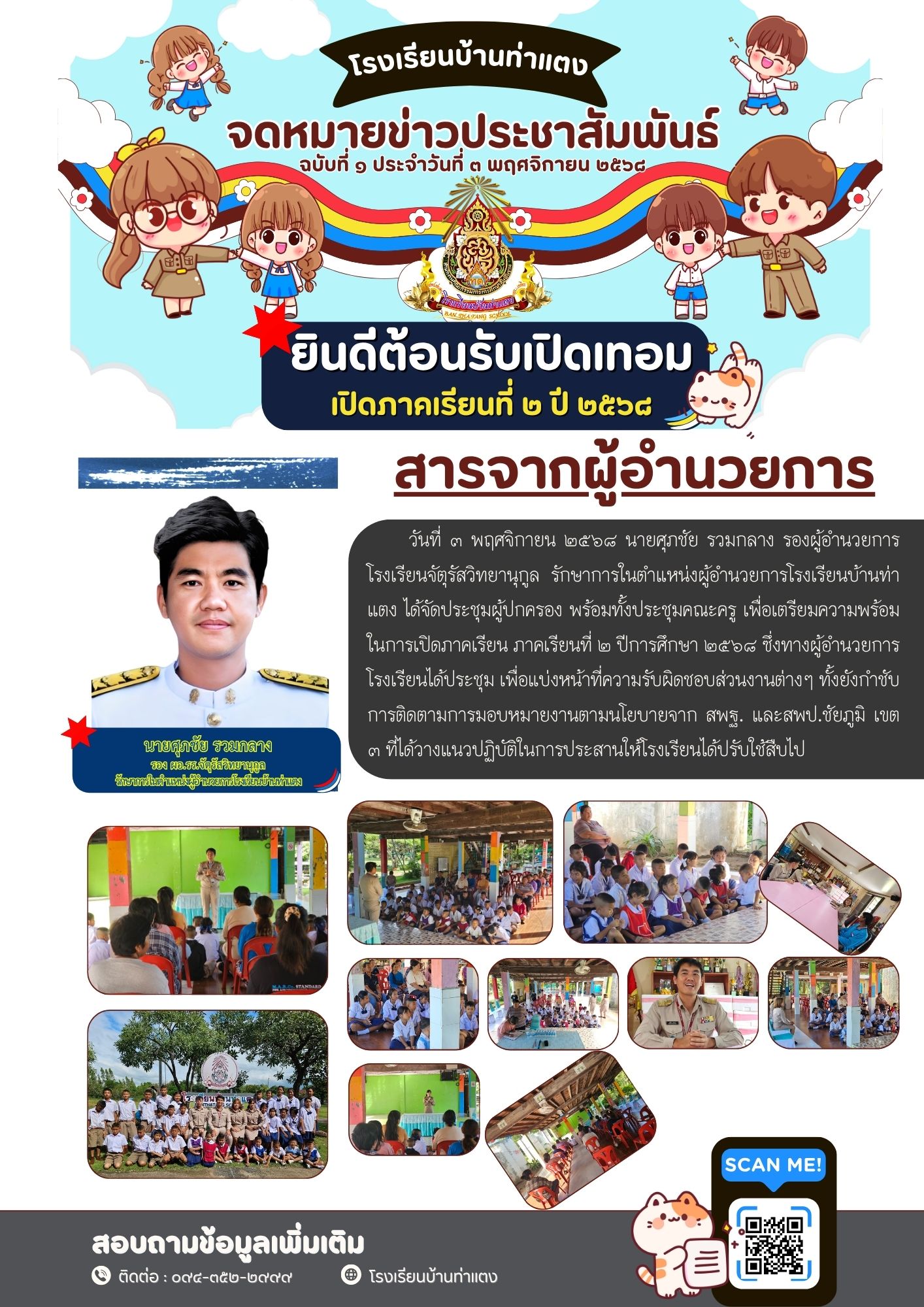 | 1 | วันที่ ๓ พฤศจิกายน ๒๕๖๘ นายศุภชัย รวมกลาง รองผู้อำนวยการโรงเรียนจัตุรัสวิทยานุกูล รักษาการในตำแหน่งผู้อำนวยการโรงเรียนบ้านท่าแตง ได้จัดประชุมผู้ปกครอง พร้อมทั้งประชุมคณะครู เพื่อเตรียมความพร้อมในการเปิดภาคเรียน ภาคเรียนที่ ๒ ปีการศึกษา ๒๕๖๘ ซึ่งทางผู้อำนวยการโรงเรียนได้ประชุม เพื่อแบ่งหน้าที่ความรับผิดชอบส่วนงานต่างๆ ทั้งยังกำชับการติดตามการมอบหมายงานตามนโยบายจาก สพฐ. และสพป.ชัยภูมิ เขต ๓ ที่ได้วางแนวปฏิบัติในการประสานให้โรงเรียนได้ปรับใช้สืบไป |