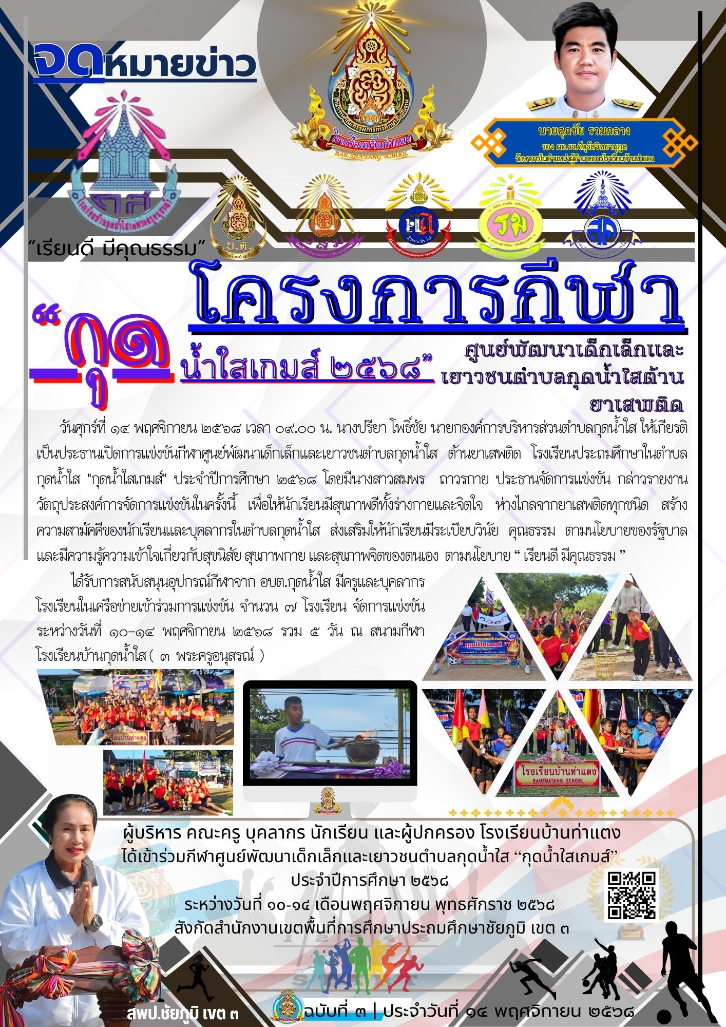 | 3 | วันศุกร์ที่ ๑๔ พฤศจิกายน ๒๕๖๘ เวลา ๐๙.๐๐ น. นางปรียา โพธิ์ชัย นายกองค์การบริหารส่วนตำบลกุดน้ำใส ให้เกียรติเป็นประธานเปิดการแข่งขันกีฬาศูนย์พัฒนาเด็กเล็กเเละเยาวชนตำบลกุดน้ำใส ต้านยาเสพติด โรงเรียนประถมศึกษาในตำบลกุดน้ำใส "กุดน้ำใสเกมส์" ประจำปีการศึกษา ๒๕๖๘ โดยมีนางสาวสมพร ถาวรกาย ประธานจัดการแข่งขัน กล่าวรายงานวัตถุประสงค์การจัดการแข่งขันในครั้งนี้ เพื่อให้นักเรียนมีสุขภาพดีทั้งร่างกายและจิตใจ ห่างไกลจากยาเสพติดทุกชนิด สร้างความสามัคคีของนักเรียนและบุคลากรในตำบลกุดน้ำใส ส่งเสริมให้นักเรียนมีระเบียบวินัย คุณธรรม ตามนโยบายของรัฐบาลและมีความรู้ความเข้าใจเกี่ยวกับสุขนิสัย สุขภาพกาย และสุขภาพจิตของตนเอง ตามนโยบาย “ เรียนดี มีคุณธรรม ” ได้รับการสนับสนุนอุปกรณ์กีฬาจาก อบต.กุดน้ำใส มีครูและบุคลากร โรงเรียนในเครือข่ายเข้าร่วมการแข่งขัน จำนวน ๗ โรงเรียน จัดการแข่งขัน ระหว่างวันที่ ๑๐-๑๔ พฤศจิกายน ๒๕๖๘ รวม ๕ วัน ณ สนามกีฬาโรงเรียนบ้านกุดน้ำใส ( ๓ พระครูอนุสรณ์ ) |
