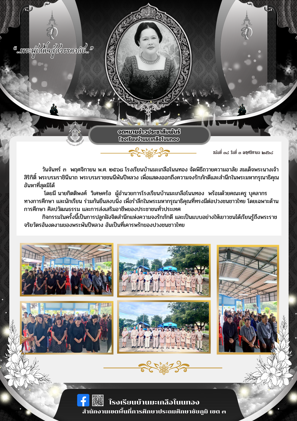 | 1 | วันจันทร์ ๓ พฤศจิกายน พ.ศ. ๒๕๖๘ โรงเรียนบ้านมะเกลือโนนทอง จัดพิธีถวายความอาลัย สมเด็จพระนางเจ้าสิริกิติ์ พระบรมราชินีนาถ พระบรมราชชนนีพันปีหลวง เพื่อแสดงออกถึงความจงรักภักดีและสำนึกในพระมหากรุณาธิคุณอันหาที่สุดมิได้