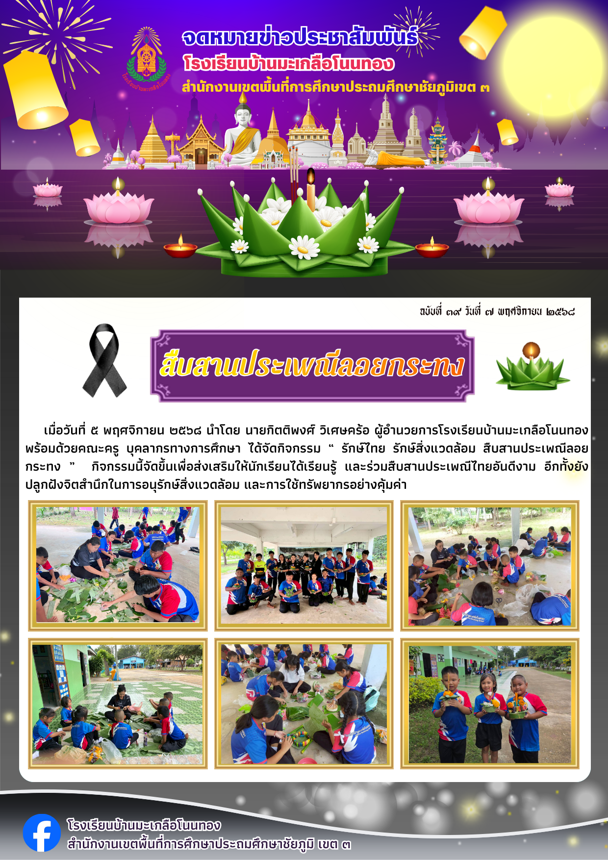 | 2 | เมื่อวันที่ ๕ พฤศจิกายน ๒๕๖๘ นำโดย นายกิตติพงศ์ วิเศษคร้อ ผู้อำนวยการโรงเรียนบ้านมะเกลือโนนทอง พร้อมด้วยคณะครู บุคลากรทางการศึกษา ได้จัดกิจกรรม “ รักษ์ไทย รักษ์สิ่งแวดล้อม สืบสานประเพณีลอยกระทง ”