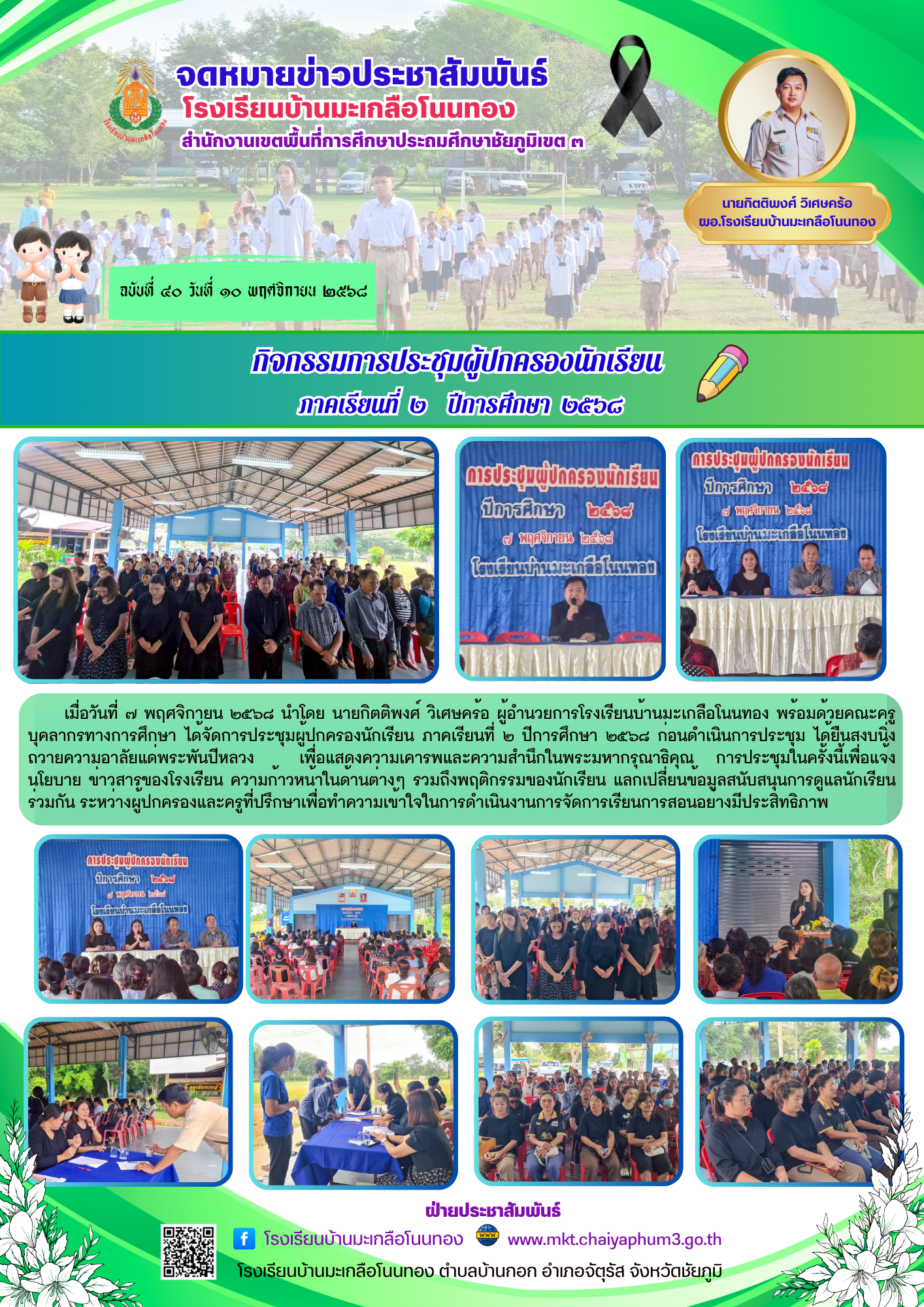 | 3 | กิจกรรมการประชุมผู้ปกครองนักเรียน ภาคเรียนที่ ๒ ปีการศึกษา ๒๕๖๘ |