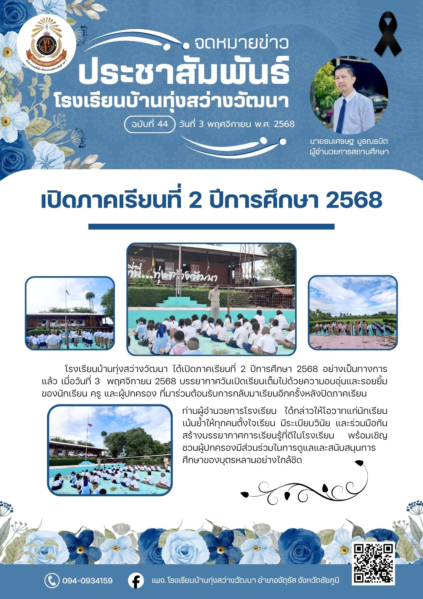| 1 | โรงเรียนบ้านทุ่งสว่างวัฒนา ได้เปิดภาคเรียนที่ 2 ปีการศึกษา 2568 อย่างเป็นทางการแล้ว เมื่อวันที่ 3 พฤศจิกายน 2568 บรรยากาศวันเปิดเรียนเต็มไปด้วยความอบอุ่นและรอยยิ้มของนักเรียน ครู และผู้ปกครอง ที่มาร่วมต้อนรับการกลับมาเรียนอีกครั้งหลังปิดภาคเรียน ท่านผู้อำนวยการโรงเรียน ได้กล่าวให้โอวาทแก่นักเรียนเน้นย้ำให้ทุกคนตั้งใจเรียน มีระเบียบวินัย และร่วมมือกันสร้างบรรยากาศการเรียนรู้ที่ดีในโรงเรียน พร้อมเชิญชวนผู้ปกครองมีส่วนร่วมในการดูแลและสนับสนุนการศึกษาของบุตรหลานอย่างใกล้ชิด